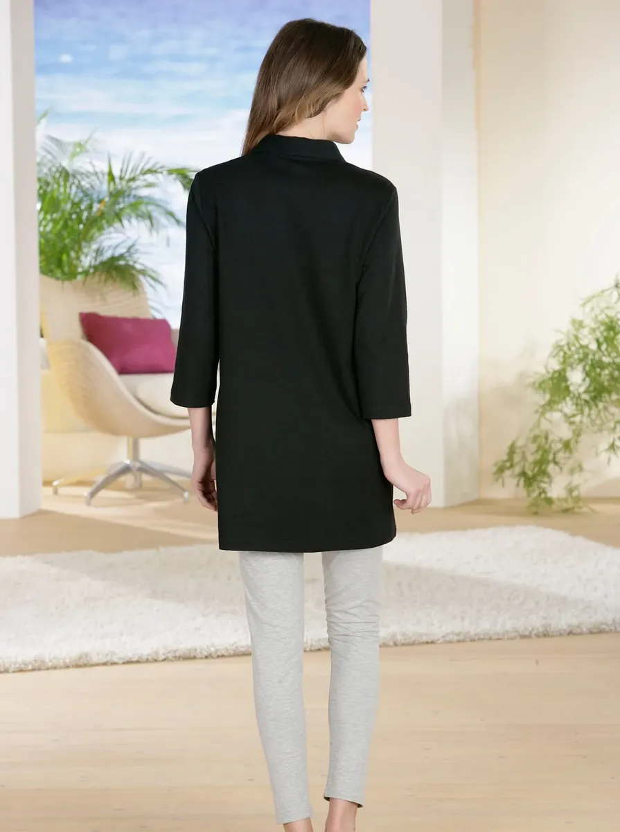 Длинная рубашка подчеркивает фигуру и выглядит изысканно благодаря воротнику с короткой планкой на пуговицах. Рукава 3/4. 100% хлопок. Машинная стирка.