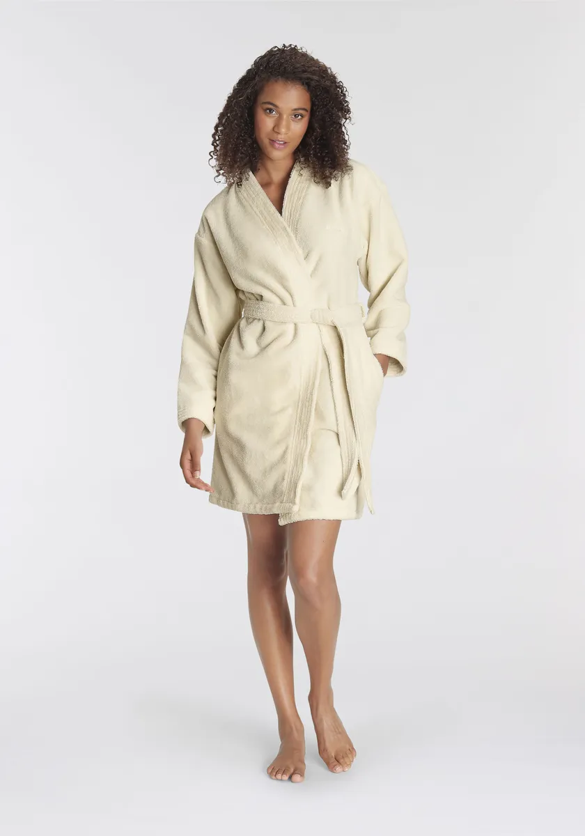 Короткий халат-кимоно с продольной стежкой на манжетах и ​​свободным поясом на талии. Изготовлен из 60% хлопка, 40% полиэстера.
