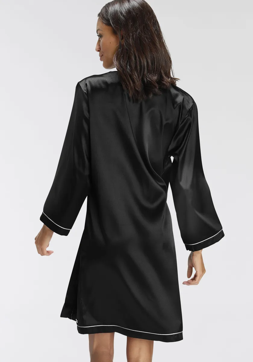 Короткое атласное кимоно с контрастной окантовкой спереди и рукавами 3/4. Свободный пояс на талии.