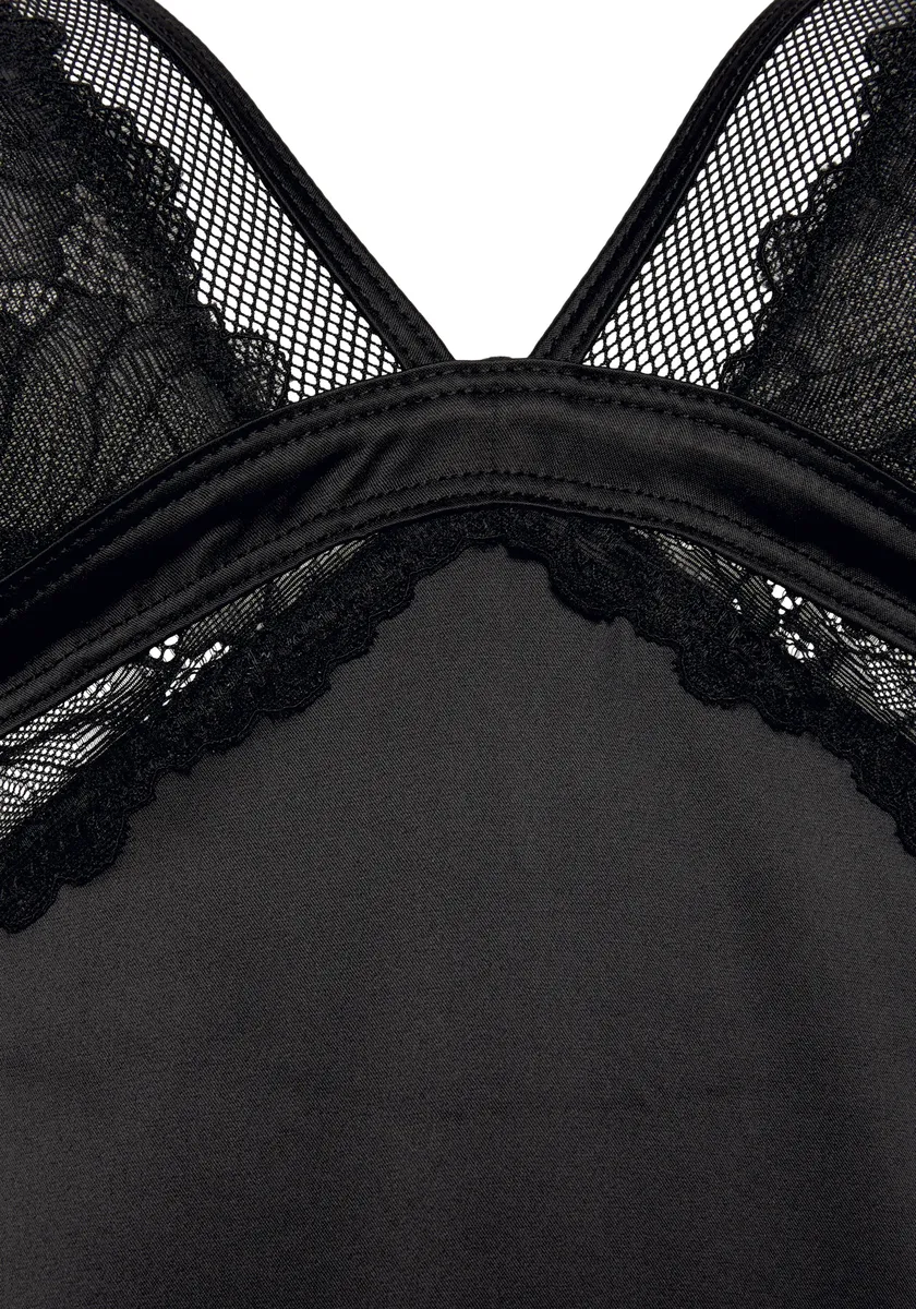 Кружевные детали на сетчатых чашках и под грудью вдоль талии до середины спинки.