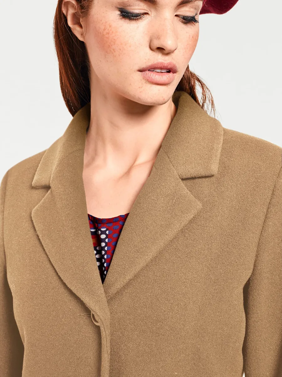 Короткое пальто классического фасона с красивым воротником с лацканами и карманами с клапанами. Облегающая фигуру форма. 80% шерсть, 20% полиамид. Подкладка: 100% полиэстер. Уборка.