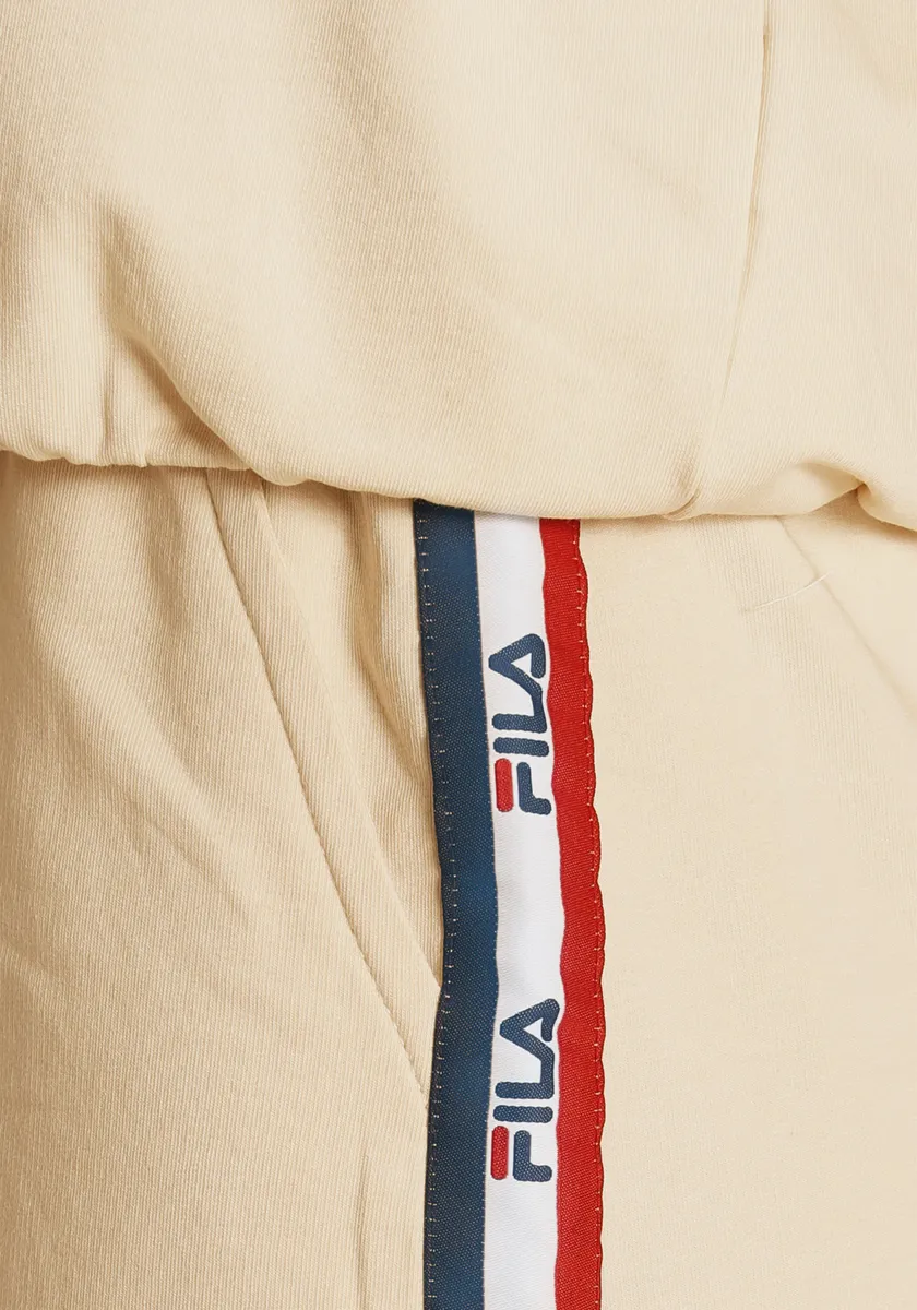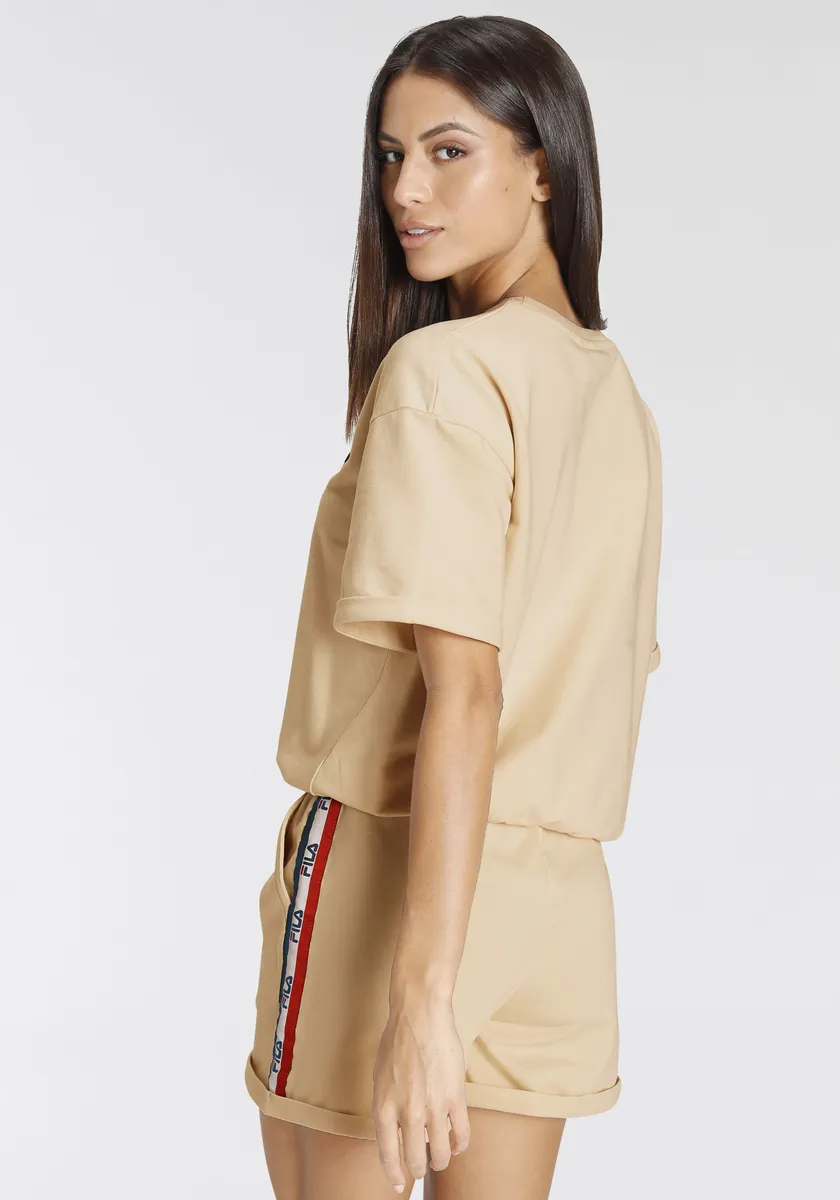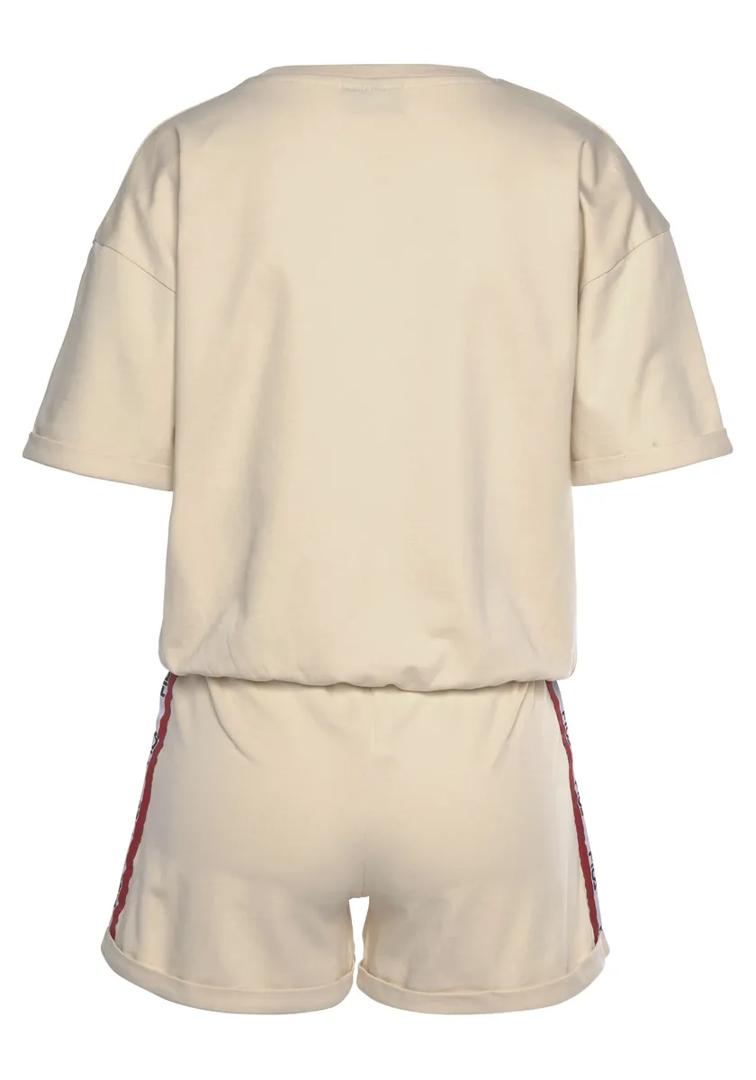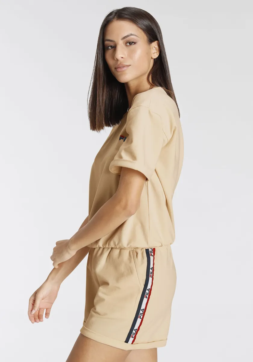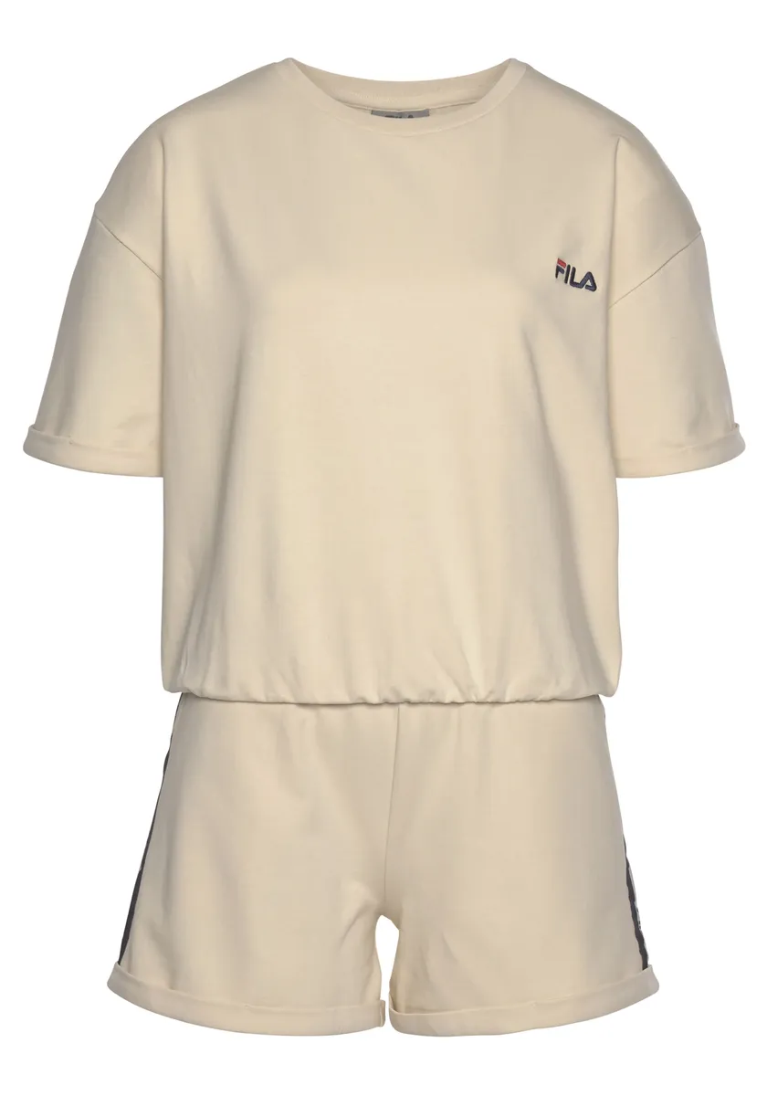 Коротышка от Филы. Рубашка с круглым вырезом, эластичным поясом, закатанными манжетами и небольшой вышивкой логотипа на груди. Шорты с эластичным поясом, боковыми карманами, подвернутыми концами штанин и тесьмой с логотипом сбоку. Изготовлен из мягкой эластичной толстовки.