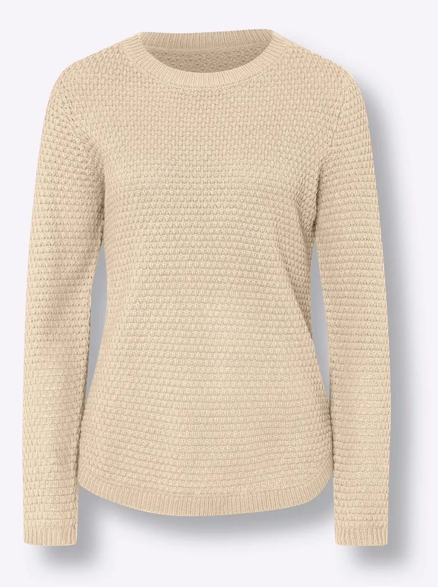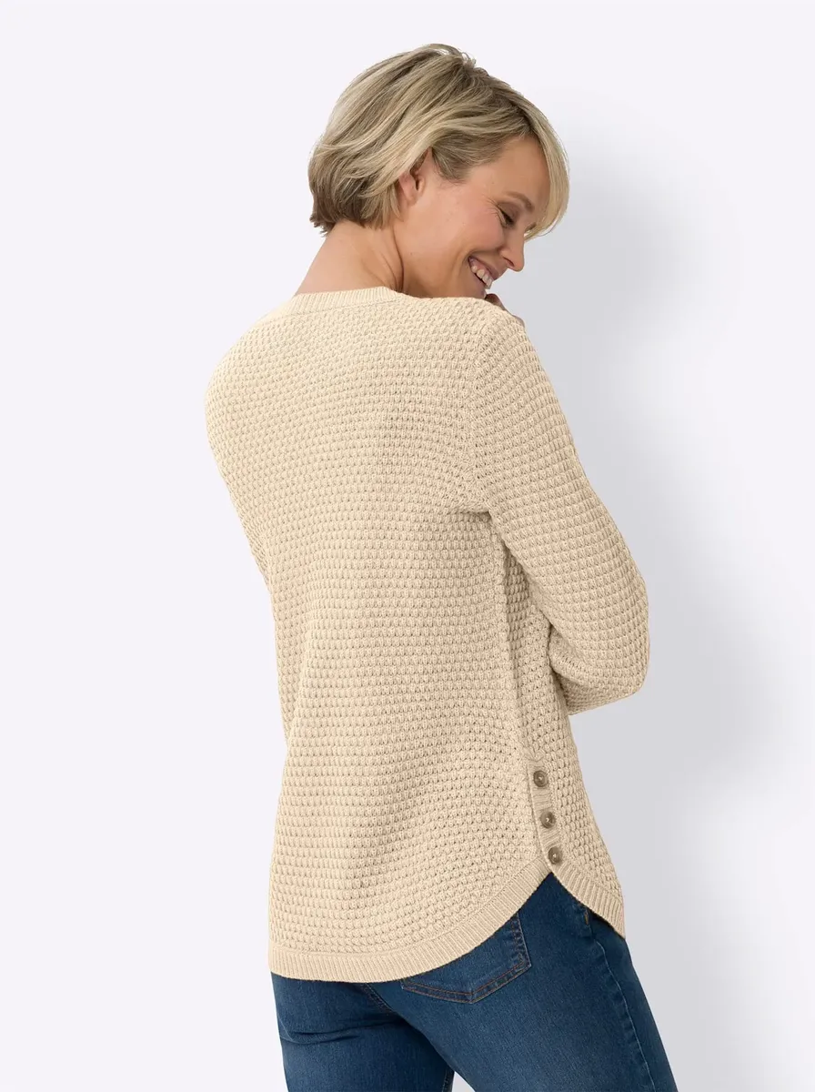 Короче говоря: настоящий фаворит! Свитер с длинными рукавами имеет красивый вязаный узор по всей поверхности, удобные рукава реглан и модный закругленный низ с декоративными пуговицами. 100% полиакрил. Машинная стирка.