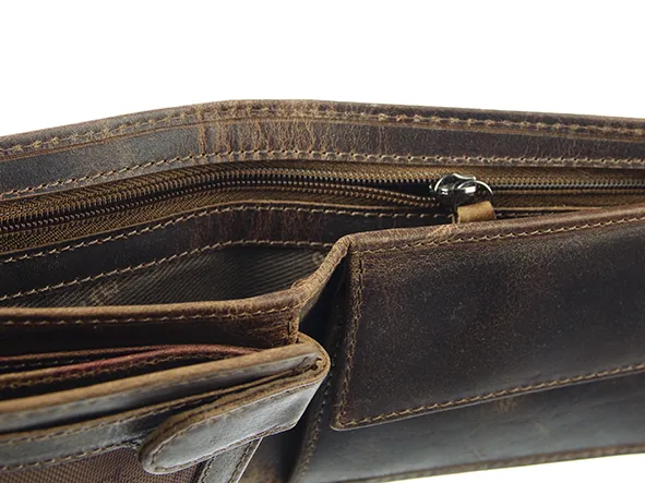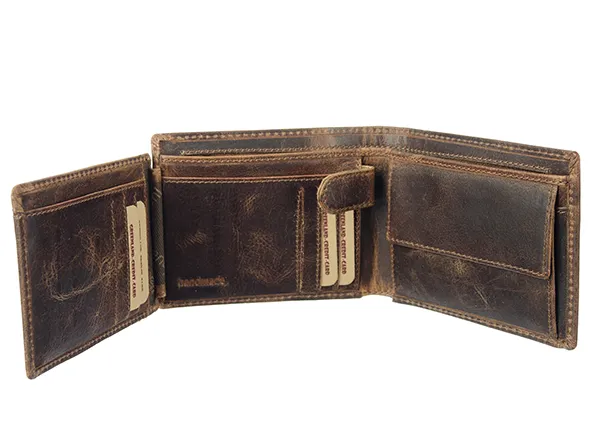 Кошелек GreenLand Nature «Монтана» из кожи буйвола. Основное отделение без закрытия. Альбомный формат. Внутреннее отделение на молнии. Отделение для монет с кнопкой. Внутри 1 видимый карман, 5 прорезных карманов, 6 отделений для карт и 1 карман для купюр. RFID-технология. гр. прибл. Ш/В/Г: 12,5/9,5/2,5 см.