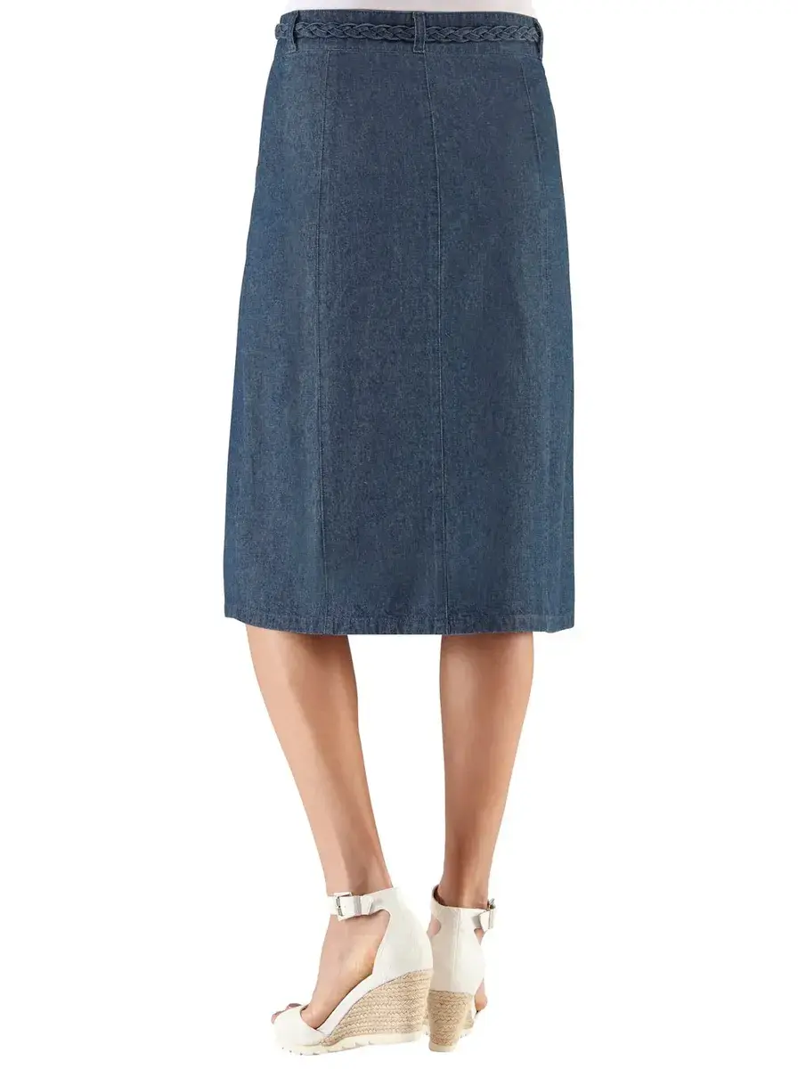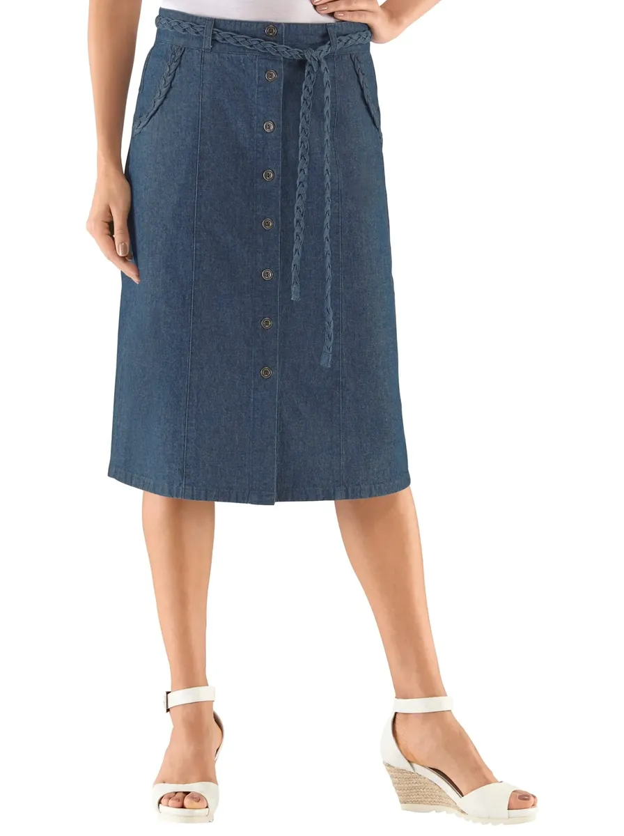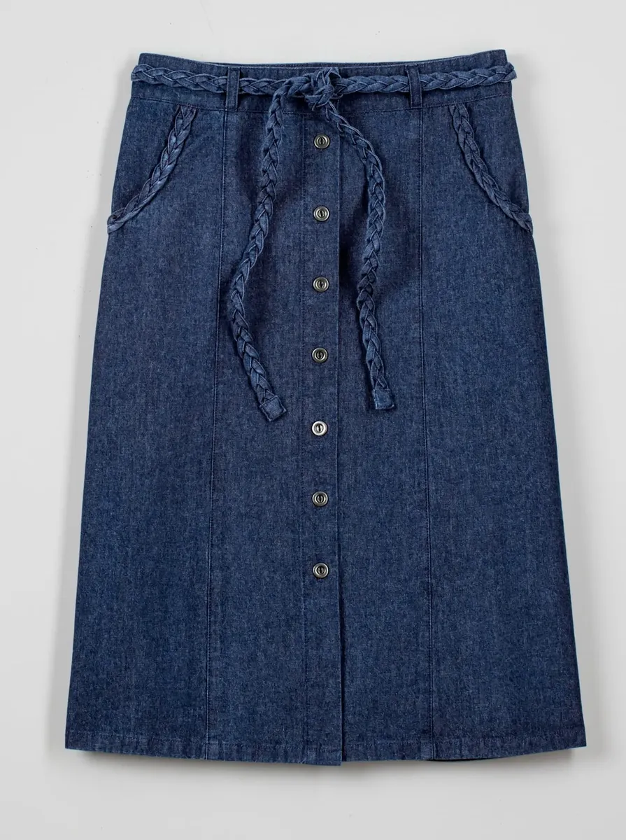 Юбка на пуговицах в джинсовом стиле с петлями для ремня и плетеным поясом. Два кармана украшены узором в виде кос. Разрез спереди для большей свободы движений. 100% хлопок. Машинная стирка. С поясом.