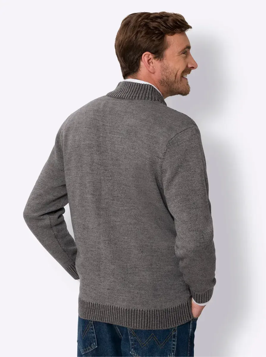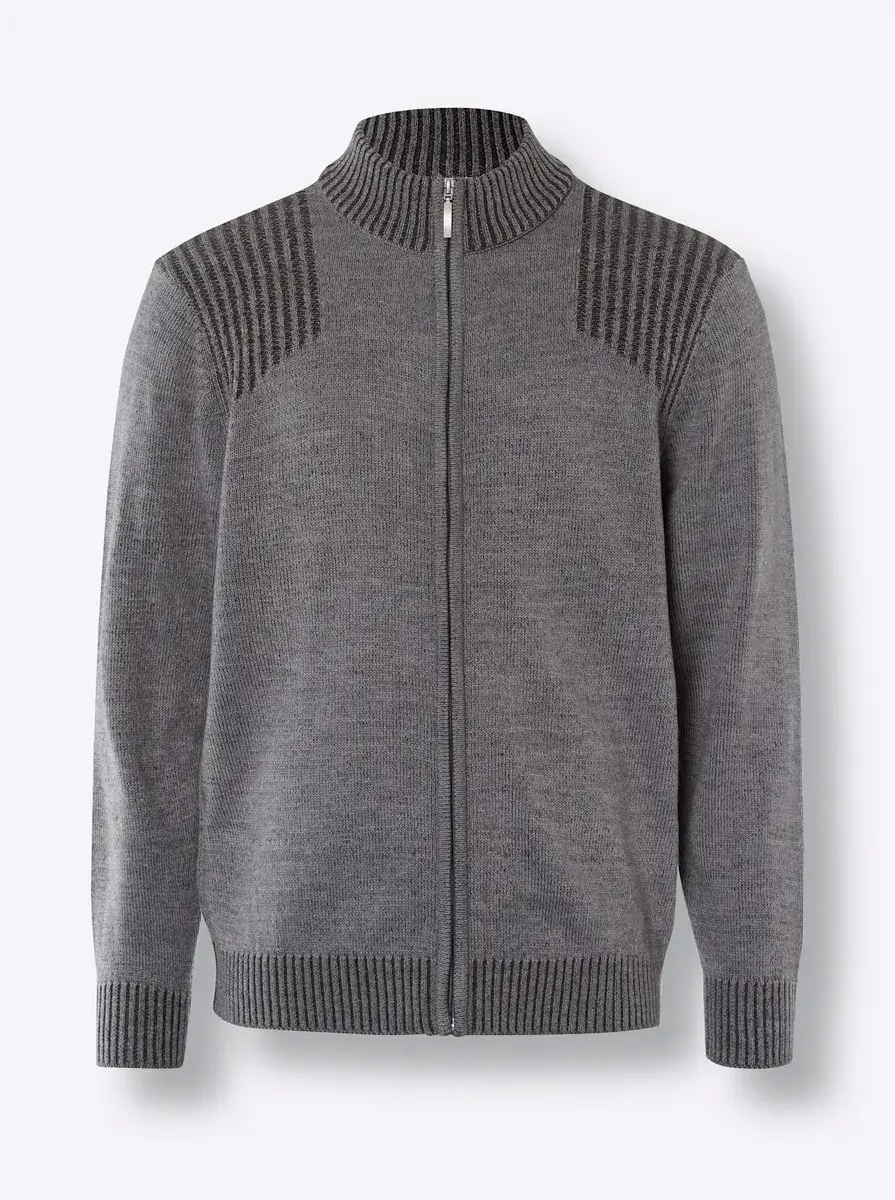 Крапчатый кардиган с двухцветными деталями. Модный воротник-стойка в рубчик. Полосатый вязаный узор на плечах спереди. Молния во всю длину. Ребристые манжеты на длинных рукавах и по нижнему краю. 100% полиакрил. Машинная стирка.