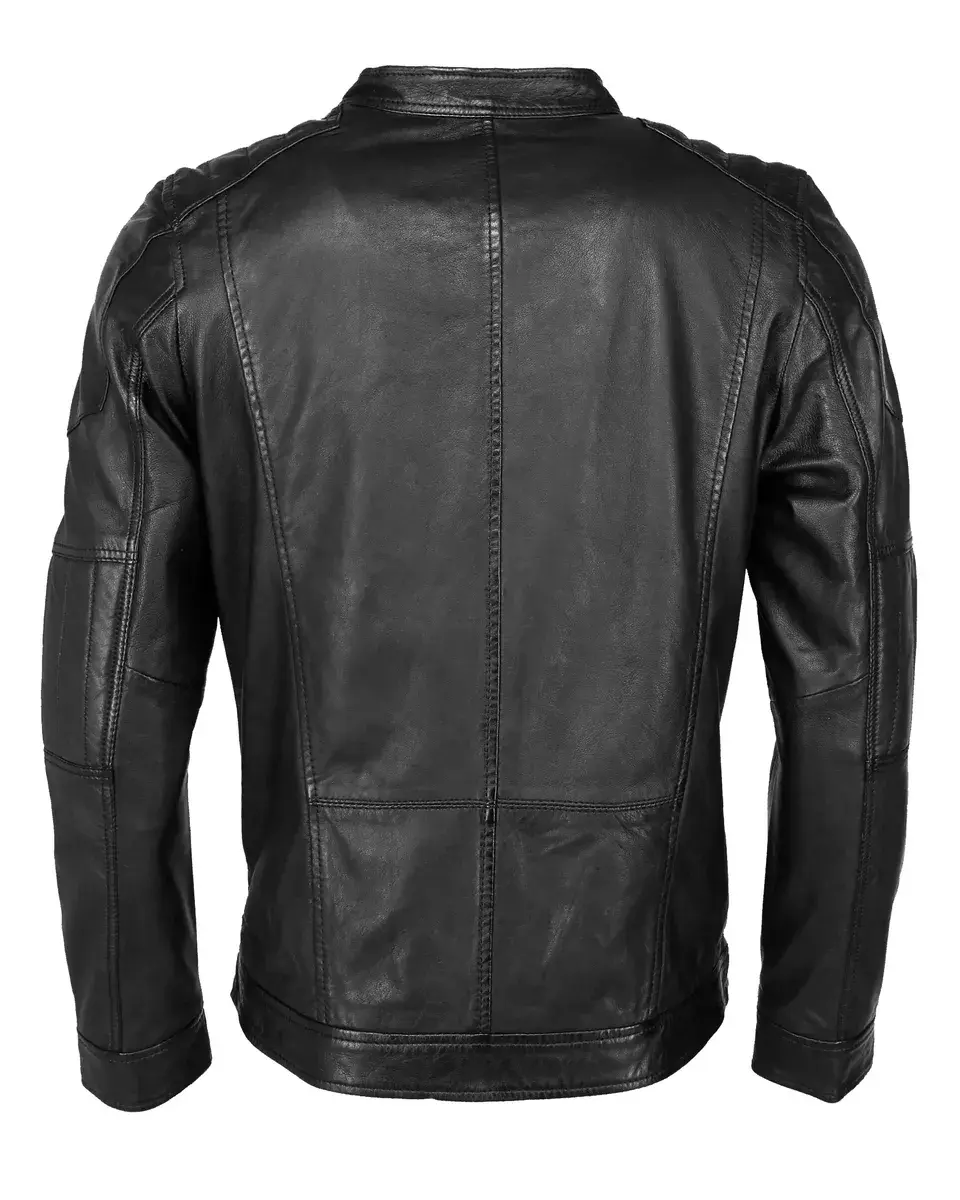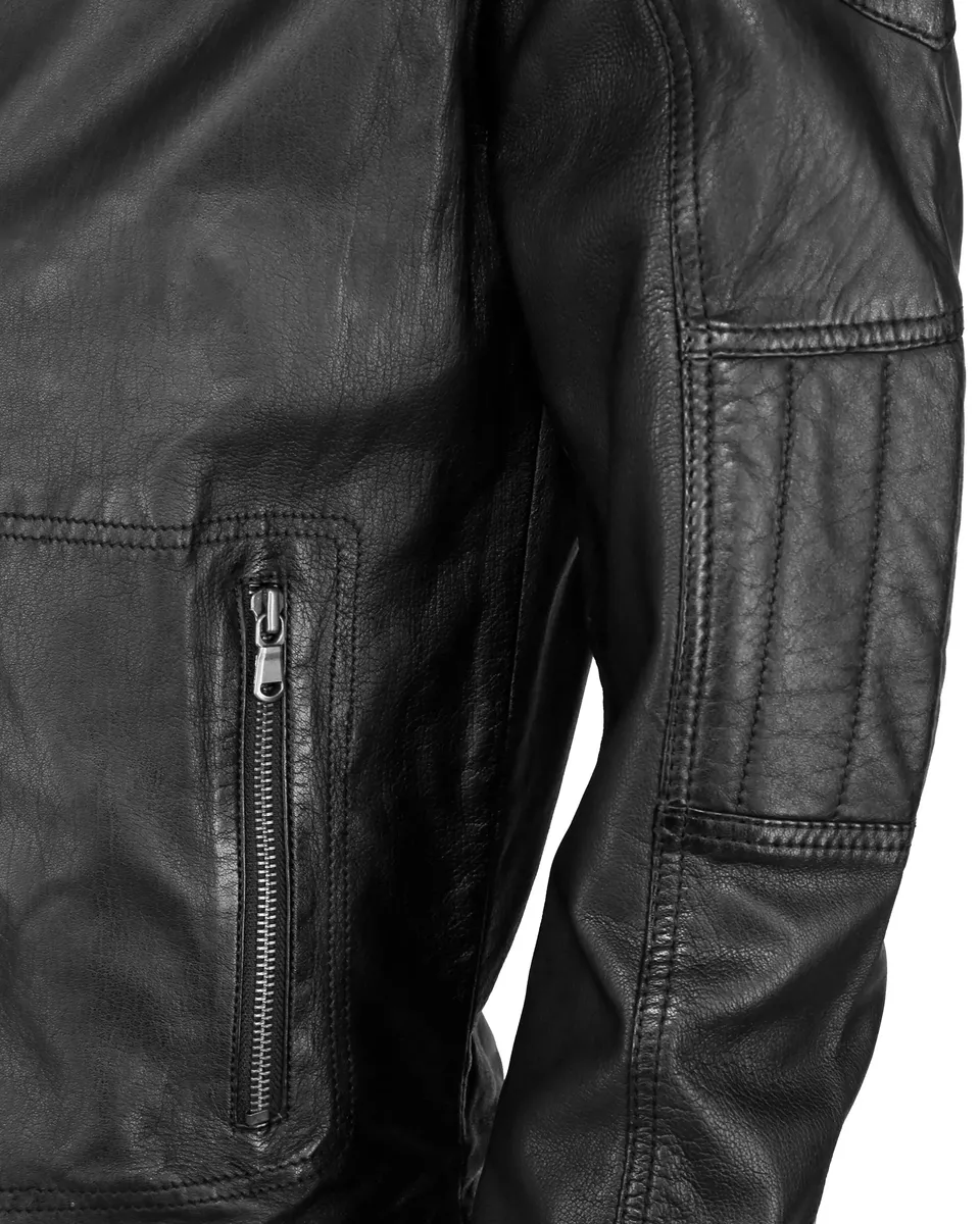 Красивая кожаная куртка с застежкой-кнопкой на шее и двумя боковыми карманами на молнии. На рукавах имеется тонкая строчка.Производитель: JCCМатериал: Внешний материал: 100% кожа / подкладка: 100% полиэстерОсобенности: строчкаОтбеливание: Не отбеливатьСтрана-производитель: ПакистанКоллекция: Весна/Лето 21Форма воротника: воротник-стойкаМатериал подкладки: ПолиэстерМатериал внешней ткани: гладкая кожаПримечание к материалу: нет/не актуальноВыкройка: uniFit: ПрямойТип/стиль изделия: Кожаная курткаДлина по спине: около 69 см для размера MСезон: Всесезонная вещьТип застежки: МолнияНабивка: нет/не актуальноЦелевая группа: Мужчины Рекомендации по уходу: Специальные чистка кожи