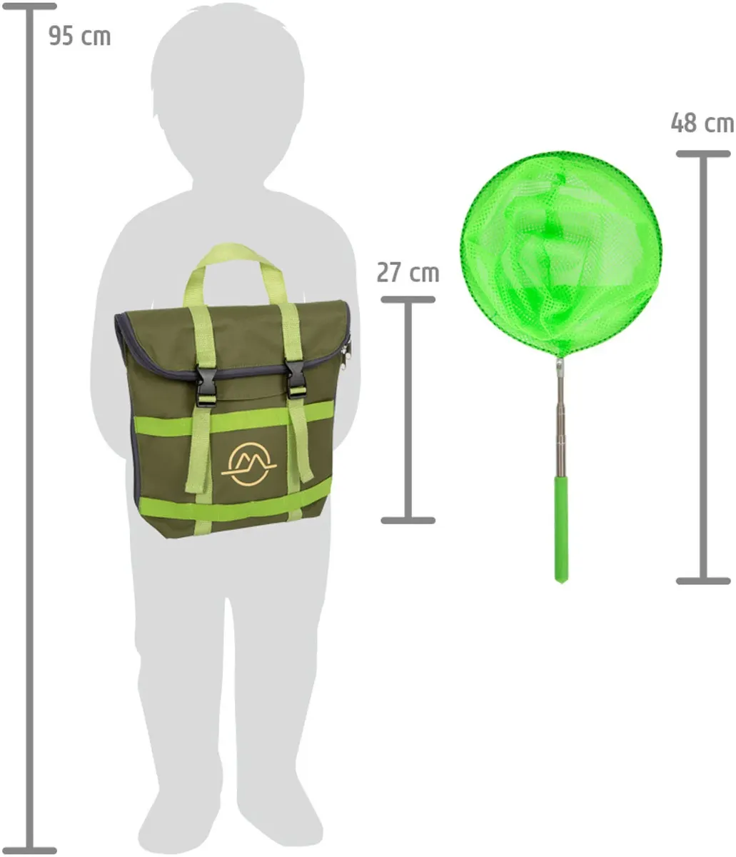 Для любителей приключений и любителей природы! Этот прочный рюкзак станет идеальным спутником в увлекательных приключенческих поездках на природу. Рюкзак вмещает все исследовательское оборудование: привинчивающееся стекло от насекомых со встроенной лупой, деревянный бинокль, сачок для бабочек/подсачек с телескопической штангой, компас со шнурком, увеличительное стекло с функцией увеличения, а также пинцет, лопатку и карабин. Практичность: очень большое отделение рюкзака оснащено широко открывающейся молнией во всю длину, регулируемыми по размеру лямками и множеством петель для крепления.