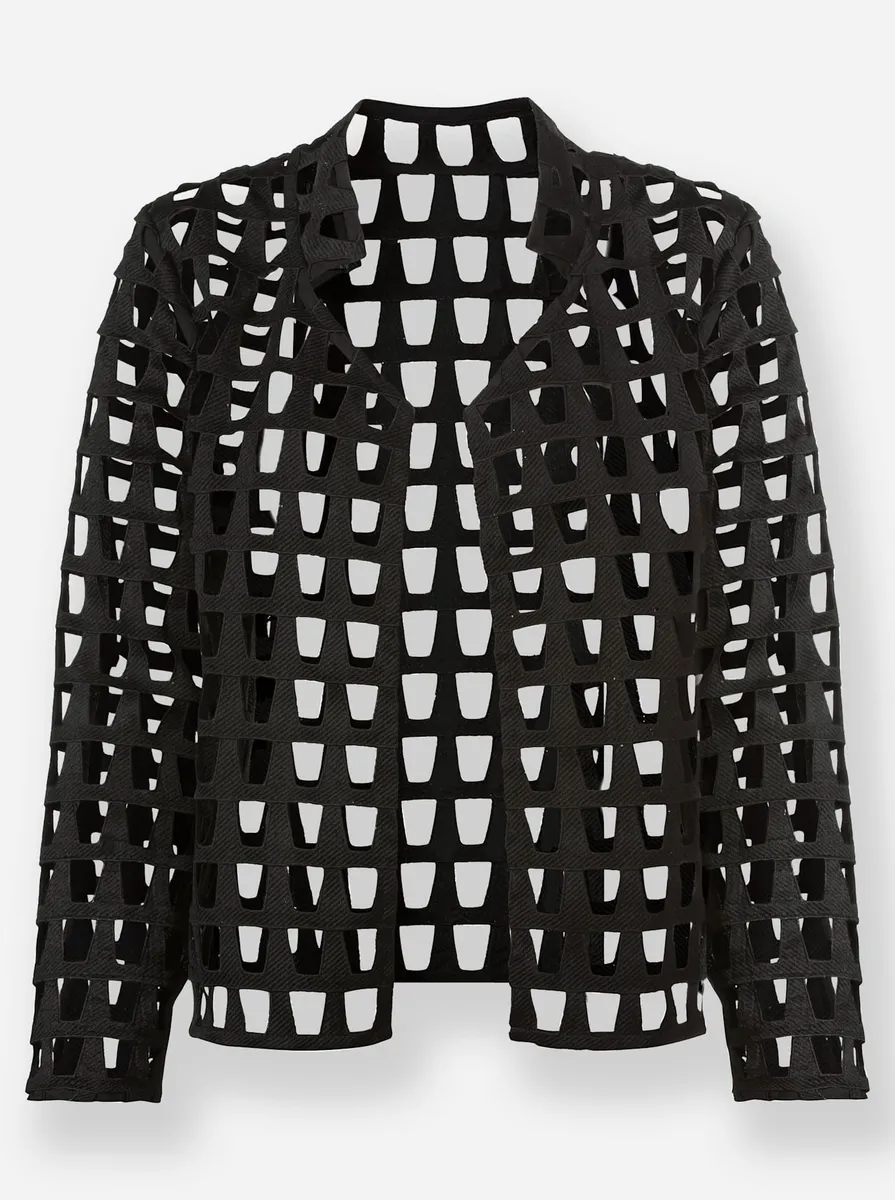 Яркий сезонный блейзер с модным рисунком отверстий по всей поверхности. С эффектным воротником стойкой и длинными рукавами. Без замка. 100% полиэстер. Машинная стирка.