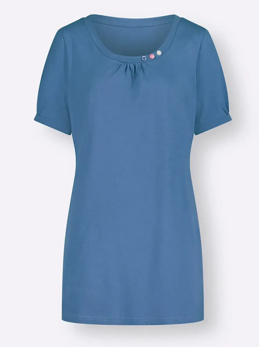 Красиво и невероятно трогательно! Рубашка с декоративными пуговицами в форме цветка и тонкими рюшами на круглом вырезе. Короткие рукава с узкими манжетами. Немного более длинный крой не только очень моден, но и хорошо скрывает. 100% хлопок. Машинная стирка.