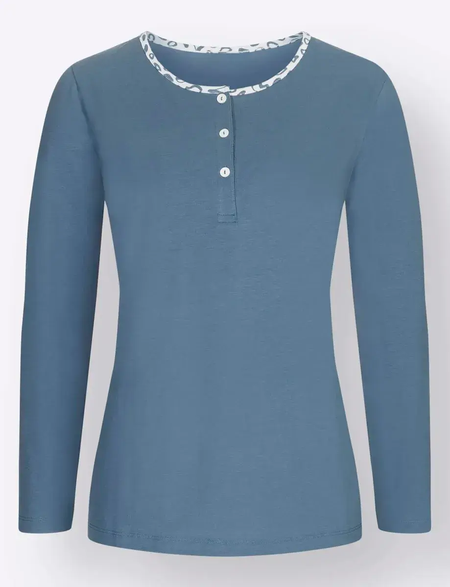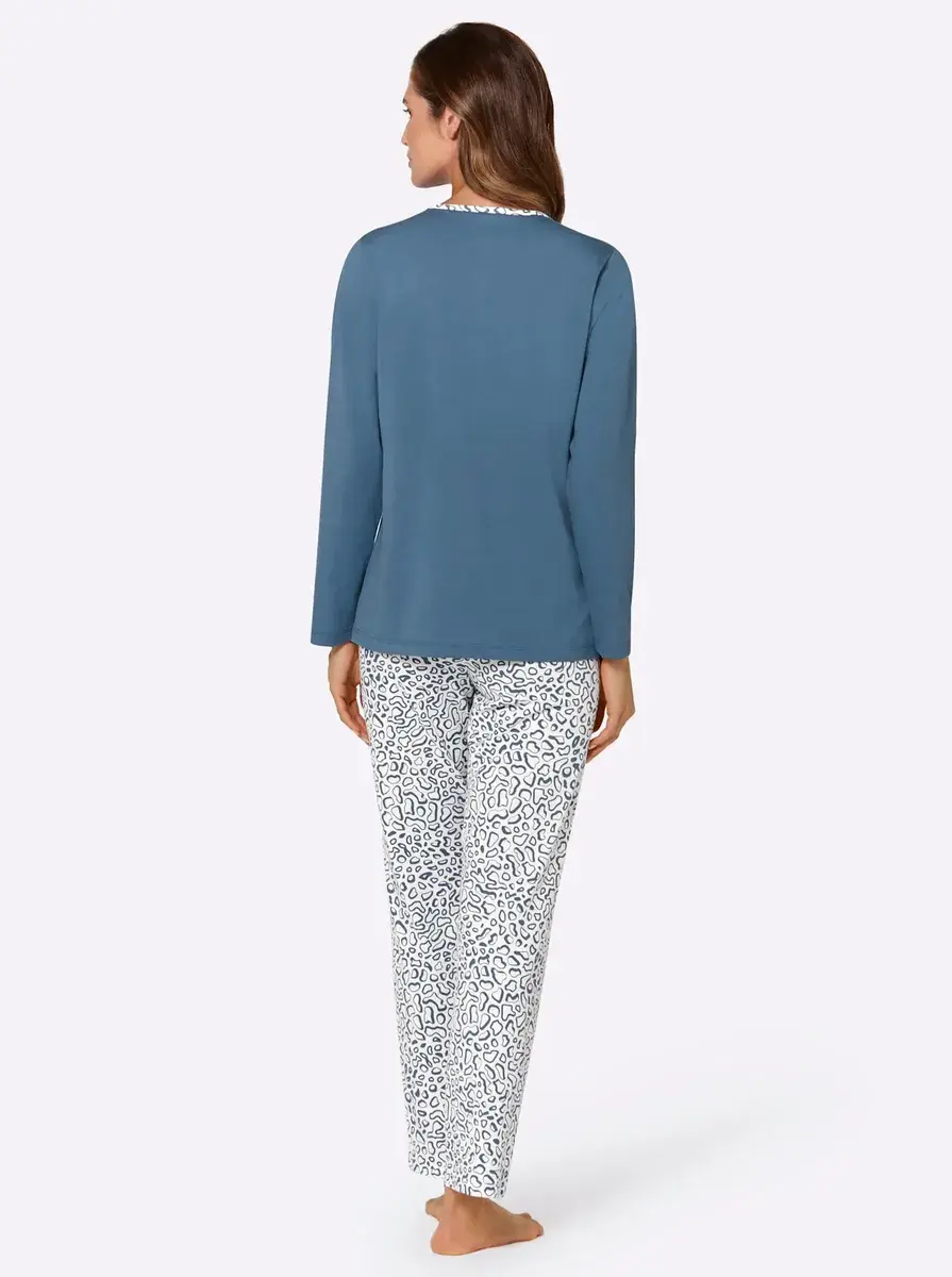 Красиво: пижама с тонкой окантовкой с принтом вдоль круглого выреза. С короткой планкой на пуговицах и длинными рукавами. Брюки на удобной эластичной резинке с принтом. Мягкий одинарный трикотаж высокого качества — своей покупкой вы поддерживаете инициативу «Хлопок, сделанный в Африке». 100% хлопок.