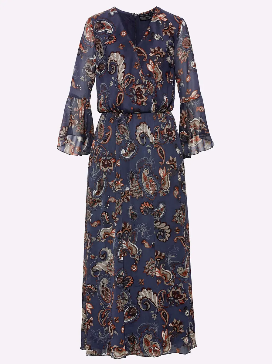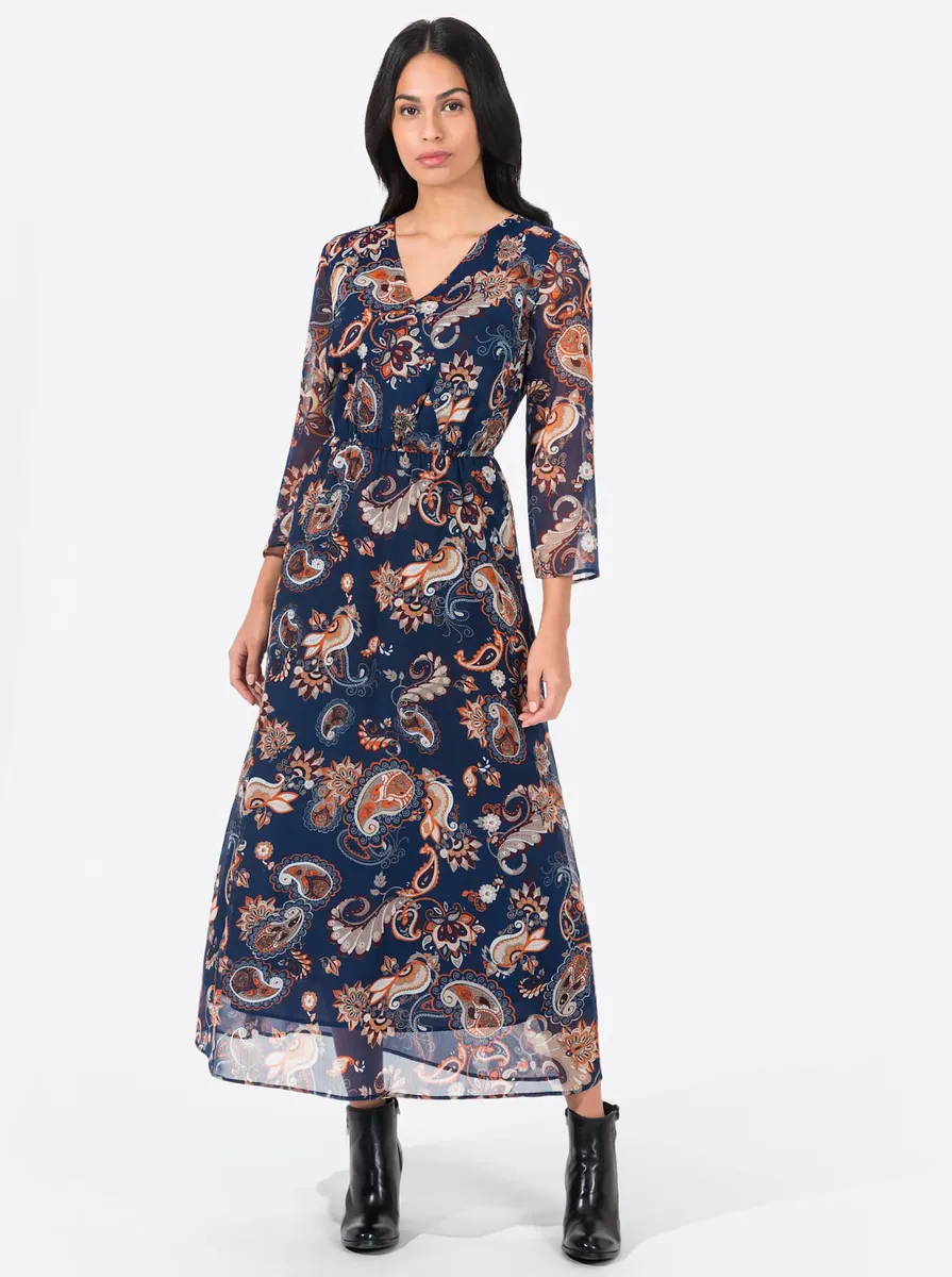 Красивое длинное платье из струящегося шифона с эффектным принтом. V-образный вырез и фиксированный запах визуально вытягивают. Эластичная вставка на талии и ниспадающая юбка позволяют спрятать небольшие подушки. Рукава слегка прозрачные 7/8. 100% полиэстер. Подкладка: 100% хлопок. Машинная стирка.