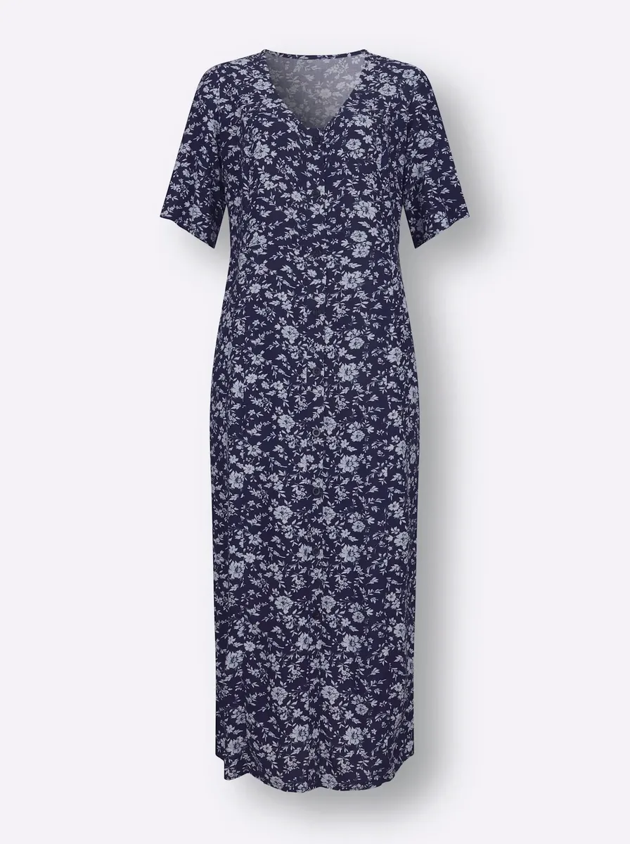 Красивое платье с цветочным принтом из мягкой, струящейся вискозной ткани. С V-образным вырезом и планкой на пуговицах во всю длину. Формирование разделительных швов спереди и сзади, а также горизонтальный разделительный шов на высоте талии. 100% вискоза. Машинная стирка.