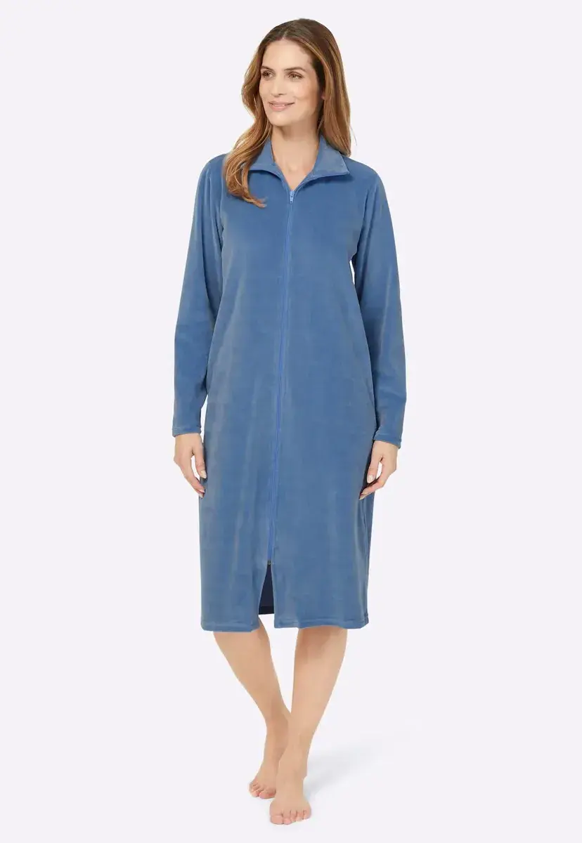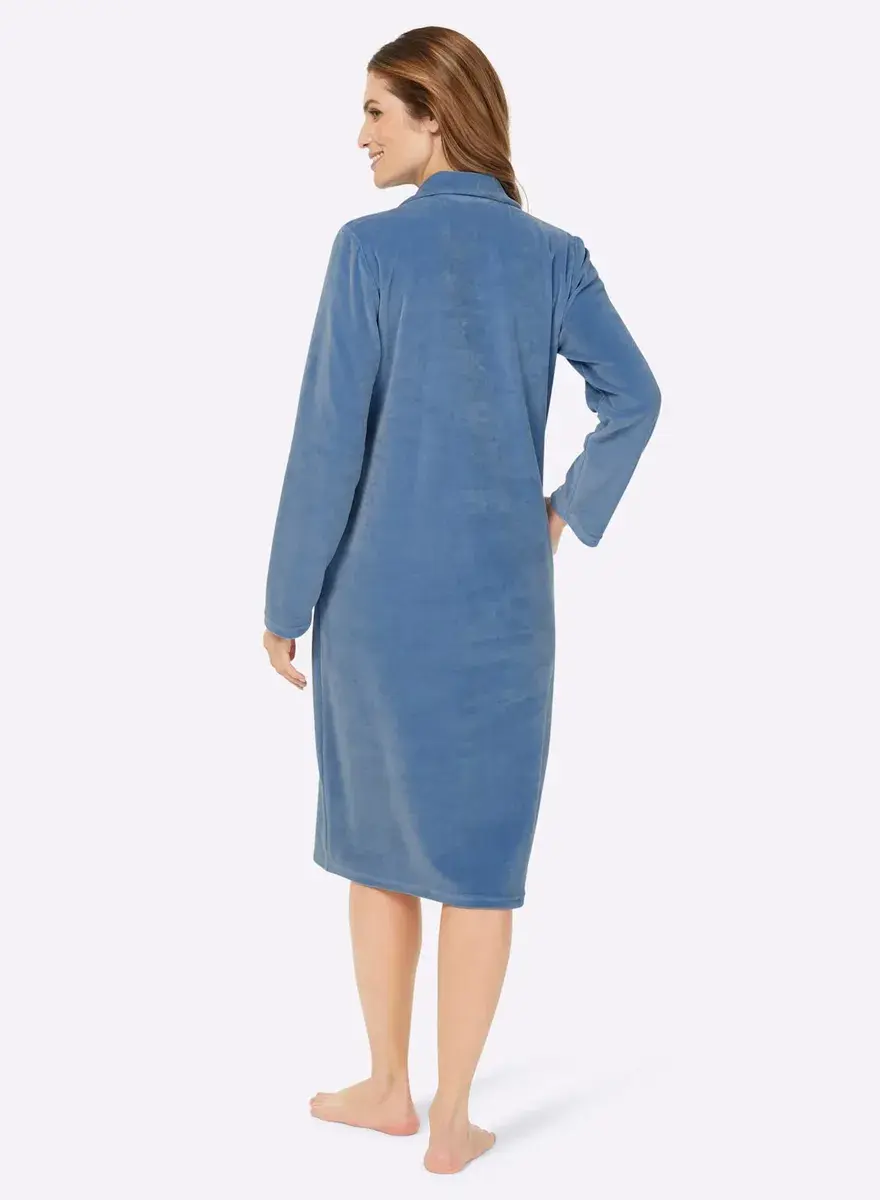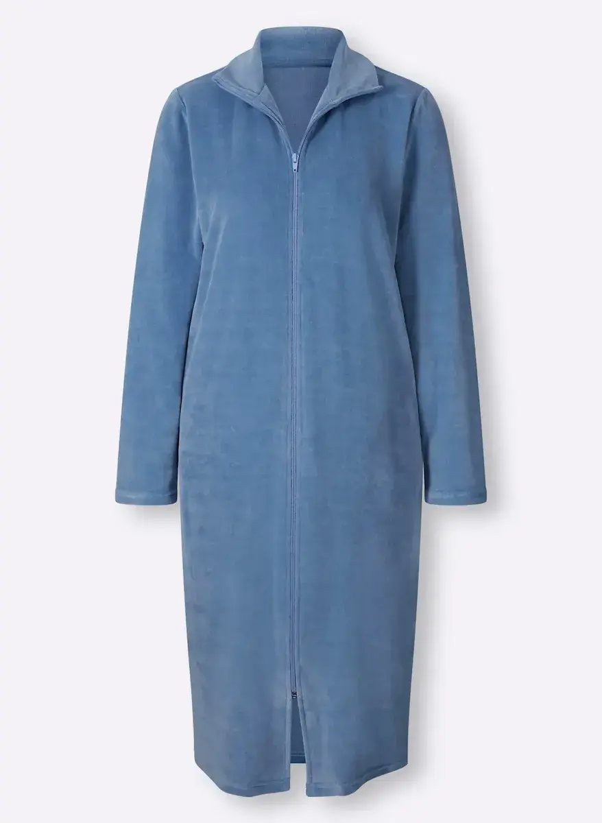 Халат из васпура бархатисто-мягкого качества Nicki. С отложным воротником и молнией во всю длину. 2 боковых кармана. Прямые градусы. Хлопковая смесь - покупая, вы поддерживаете инициативу «Хлопок, сделанный в Африке». 70% хлопок, 30% полиэстер.