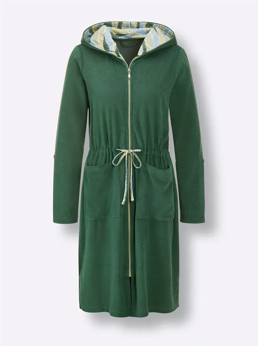 Халат из легкой махровой ткани идеально адаптируется к вашим пожеланиям: длинные рукава можно закатать и зафиксировать, а ширину легко регулировать индивидуально с помощью кулиски и завязки на талии. Капюшон с узорчатыми акцентами, практичная молния и 2 кармана. От хорошего самочувствия. Поддержите инициативу «Хлопок, сделанный в Африке». 80% хлопок, 20% полиэстер. Подкладка капюшона: 100% хлопок.