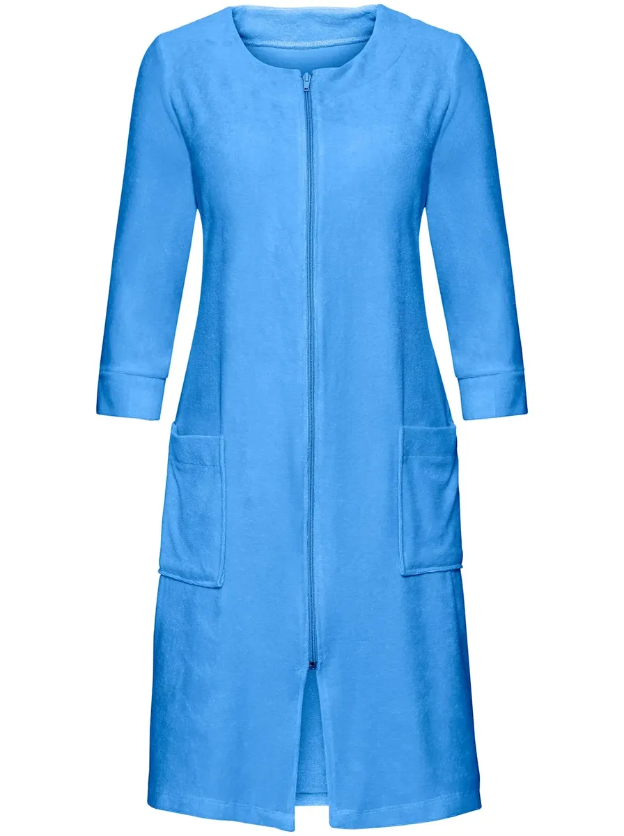 Халат из мягкой, легкой махровой ткани. С круглым вырезом, молнией во всю длину и 2 накладными карманами. Рукава 3/4 с небольшим разрезом. 80% хлопок, 20% полиэстер.
