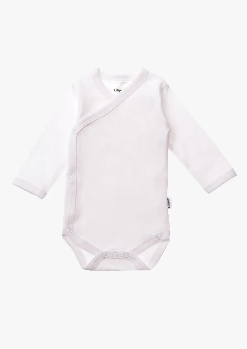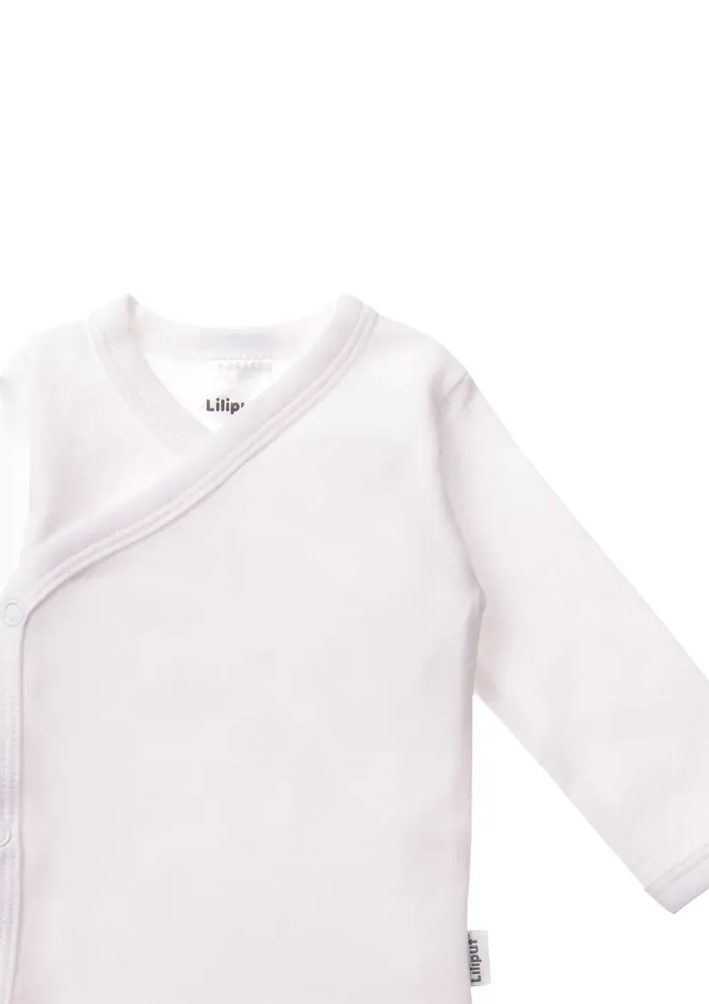 В этот комплект от Liliput входят два боди с запахом и длинными рукавами из чистого хлопка. Один однотонный, другой в полоску. Длинная планка на кнопках позволяет легко надевать и снимать куртку. Смена подгузников происходит быстро и легко благодаря кнопкам в промежности. Как всегда во всех продуктах Liliput, качество мягкого чистого хлопка впечатляет.