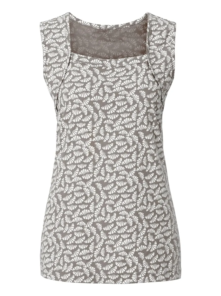 Красивый принтованный топ с модным квадратным вырезом и широкими бретелями. 50% хлопок, 50% модал. Машинная стирка.