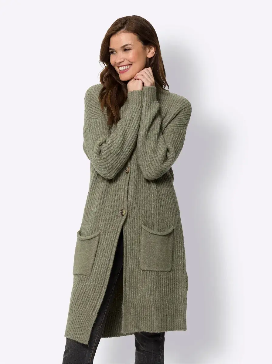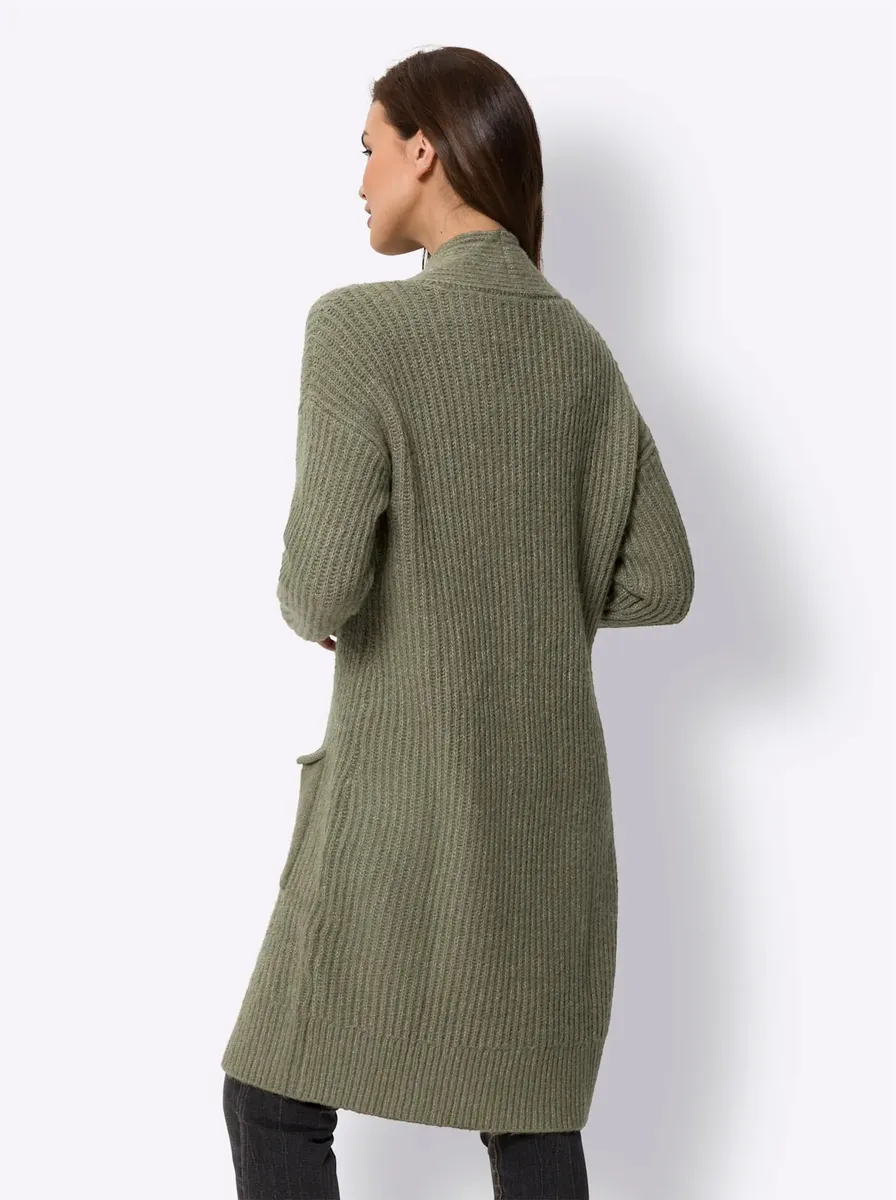 Кардиган из пестрой крупной вязки со спущенной линией плеч, длинными рукавами и ребристыми манжетами. С карманами; Роговые пуговицы. 74% полиакрил, 23% полиэстер, 3% эластан. Машинная стирка.
