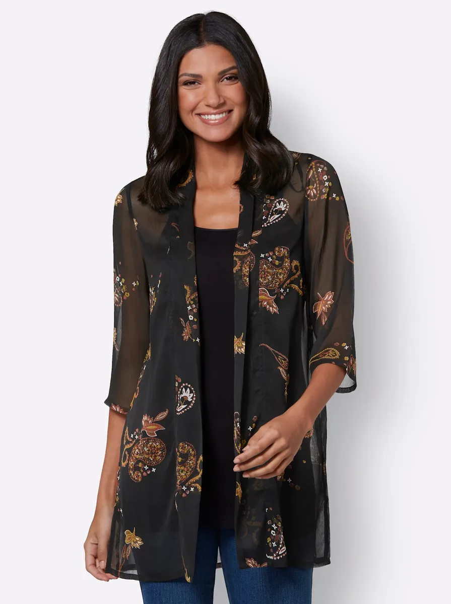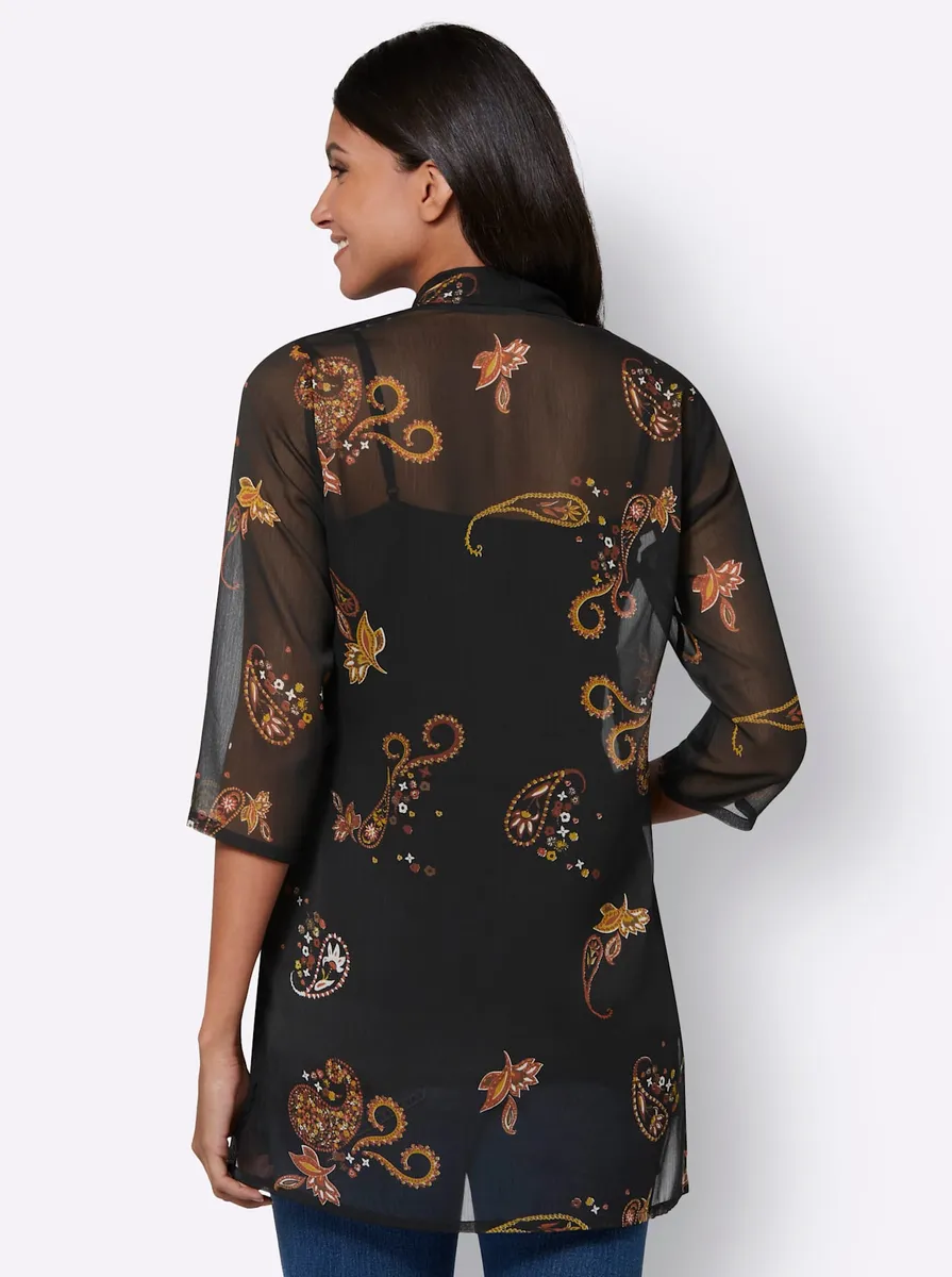 Вау, как красиво! Модная открытая длинная блузка с шикарным узором пейсли. Эффектный шалевый воротник, рукава 3/4 и длинные разрезы по бокам. 100% полиэстер. Машинная стирка.