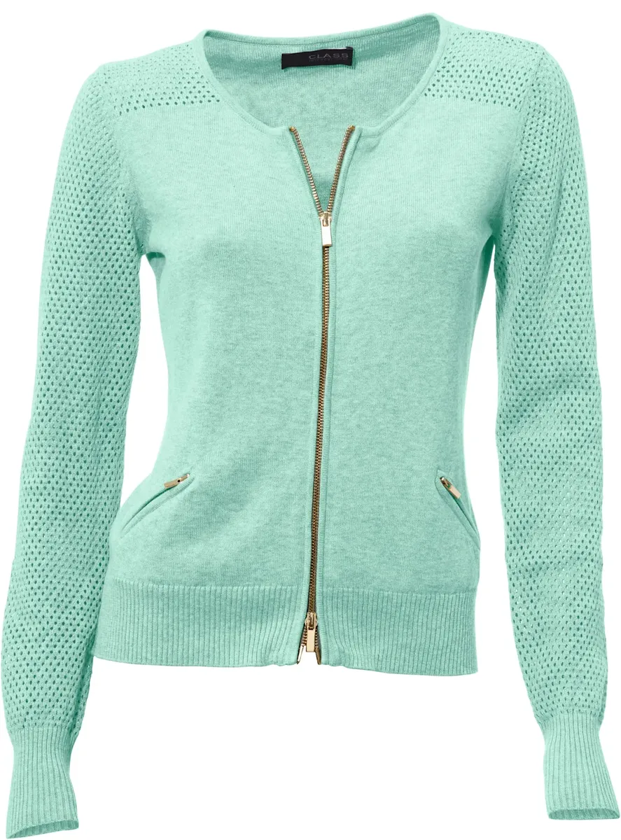 Кардиган Модный ажурный узор. Приятная мягкая тонкая вязка. Облегающая фигуру форма. С двусторонней молнией и карманами на молнии. С длинными рукавами. Длина около 60 см. 90% хлопок, 10% шелк. Машинная стирка.