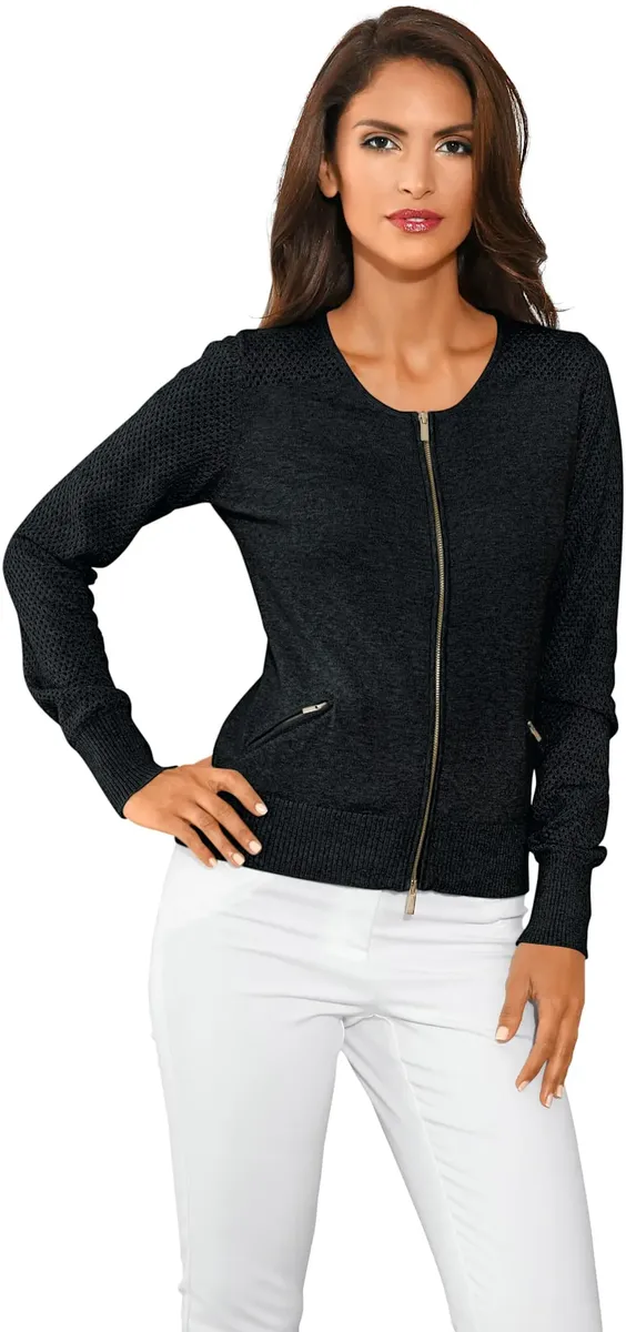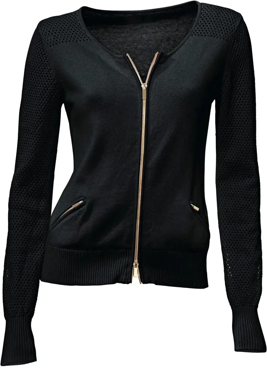 Кардиган Модный ажурный узор. Приятная мягкая тонкая вязка. Облегающая фигуру форма. С двусторонней молнией и карманами на молнии. С длинными рукавами. Длина около 60 см. 90% хлопок, 10% шелк. Машинная стирка.