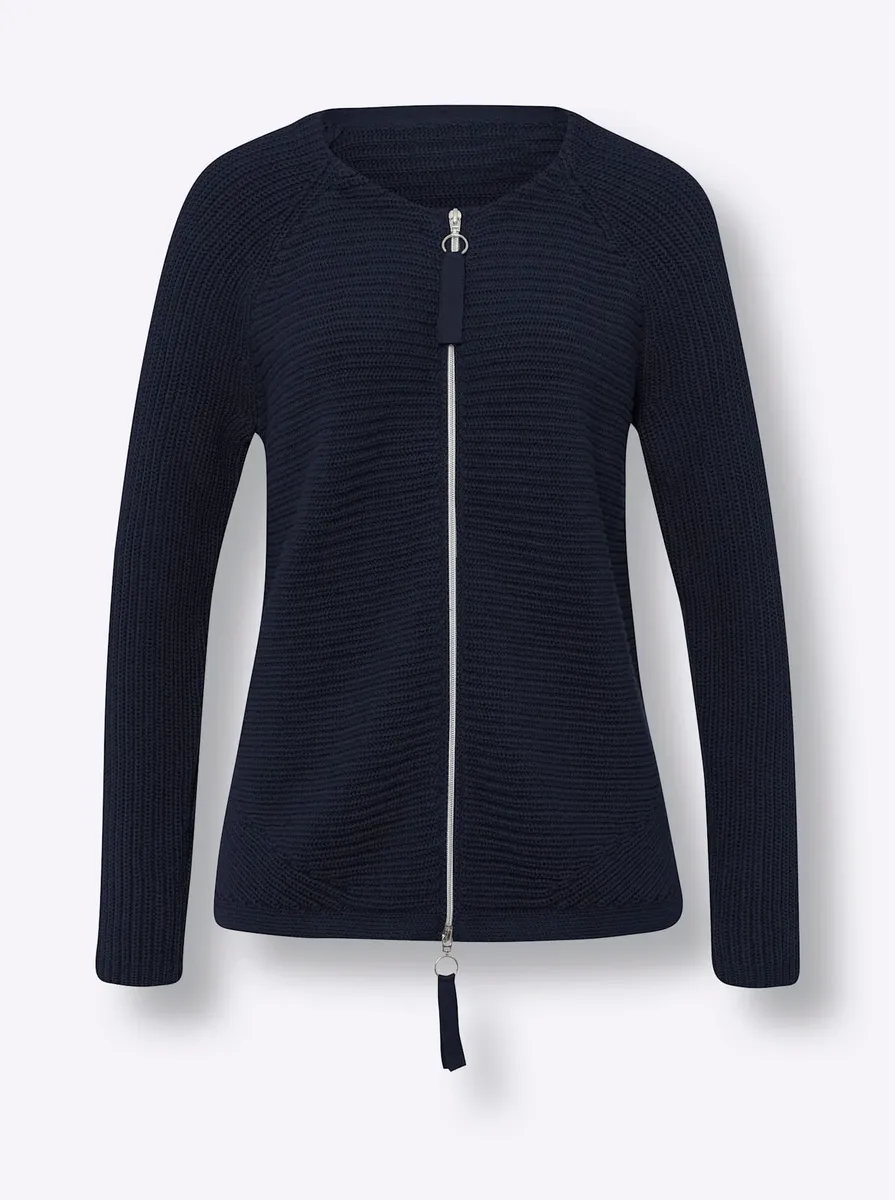 Кардиган Мягкий ребристый трикотаж из чистого хлопка с легким блеском. С круглым вырезом, двусторонней молнией и длинными рукавами. Сертифицирован ГОТС. 100% хлопок. Машинная стирка.