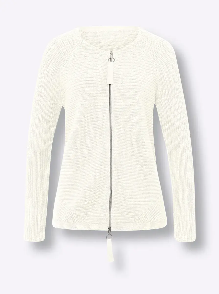 Кардиган Мягкий ребристый трикотаж из чистого хлопка с легким блеском. С круглым вырезом, двусторонней молнией и длинными рукавами. Сертифицирован ГОТС. 100% хлопок. Машинная стирка.
