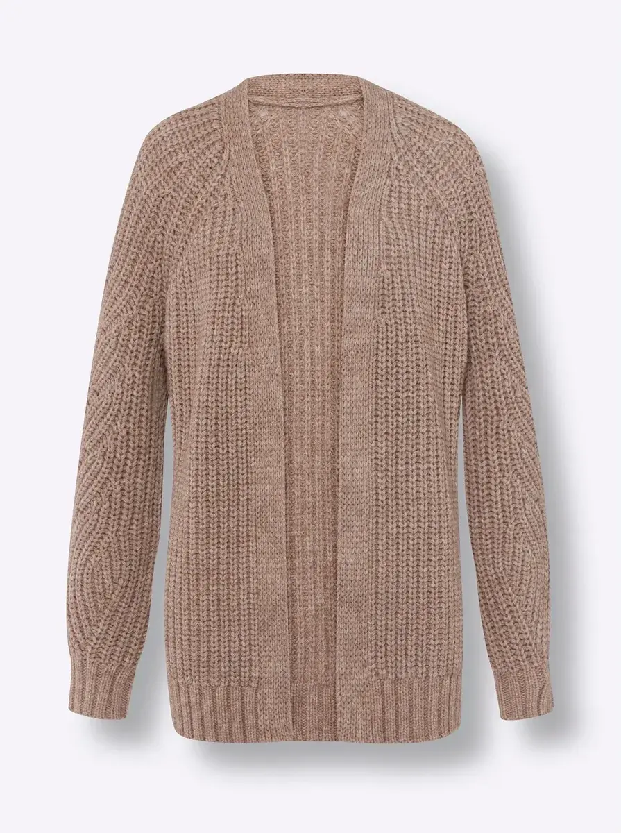 Кардиган Мягкий, ребристый, крупной вязки, меланжевого цвета. Изысканный трикотаж Ajour на длинных рукавах. Бесзамковая форма. 45% полиакрил, 30% полиамид, 25% полиэстер. Машинная стирка.