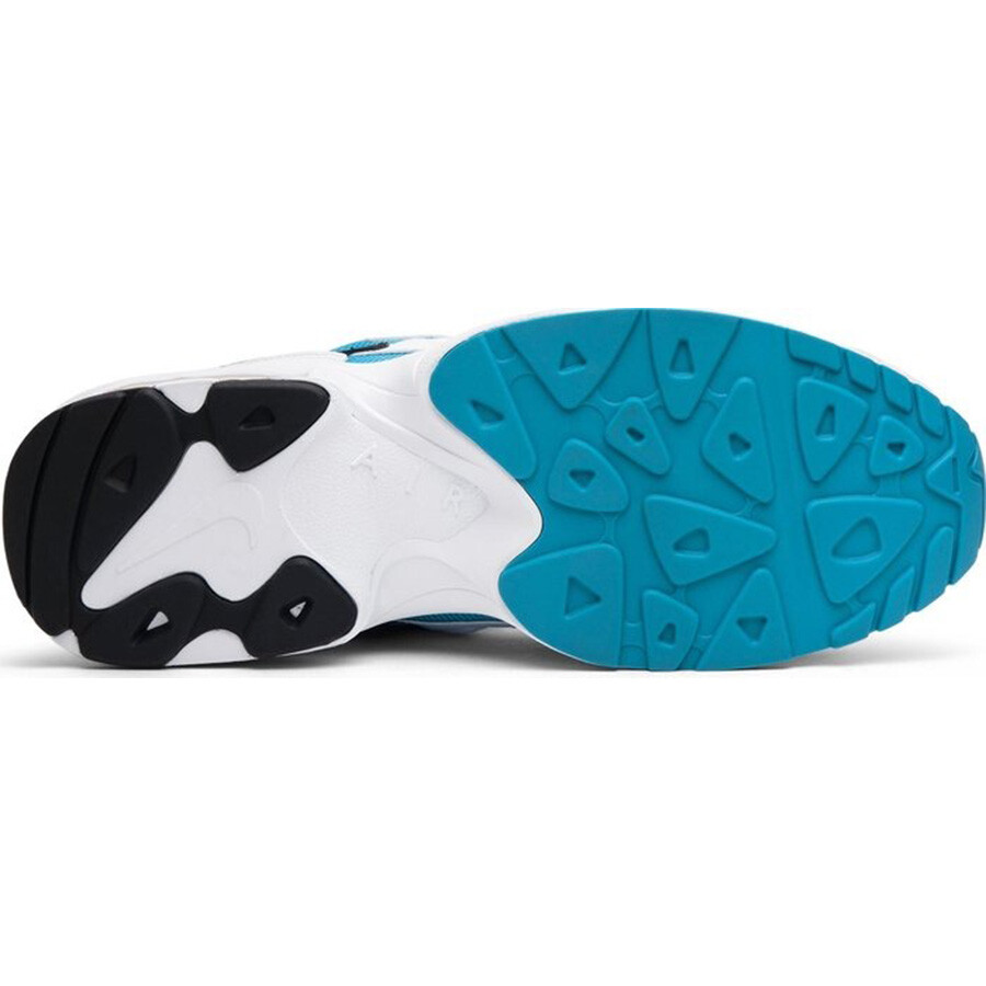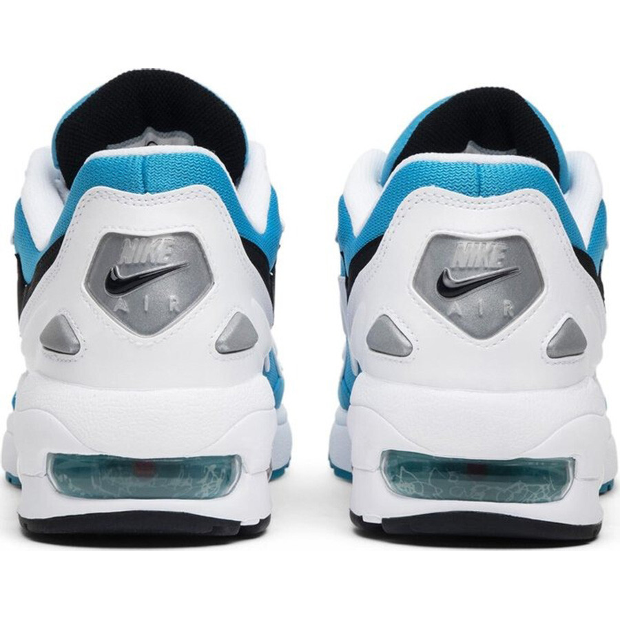 Мужские кроссовки Air Max 2 Light от бренда Nike в расцветке "Dolphins". Переиздание модели 1994 года в сочетании бирюзового и белого цветов с контрастным черным Swoosh. Модель с широким голенищем и пяткой на толстой подошве из пеноматериала с амортизирующей вставкой.