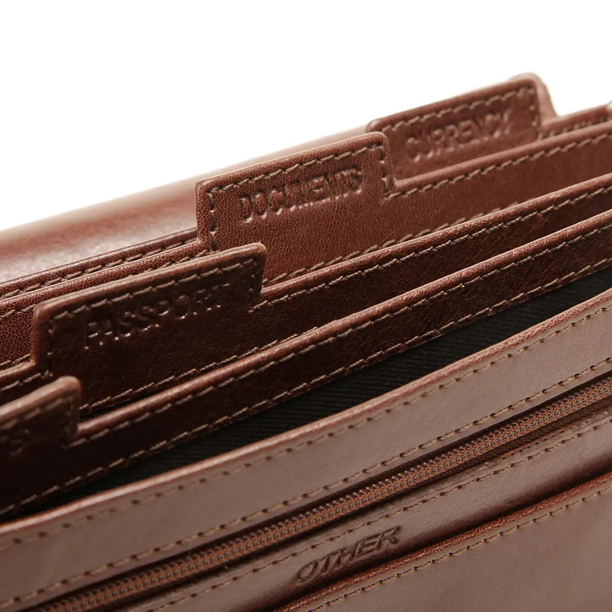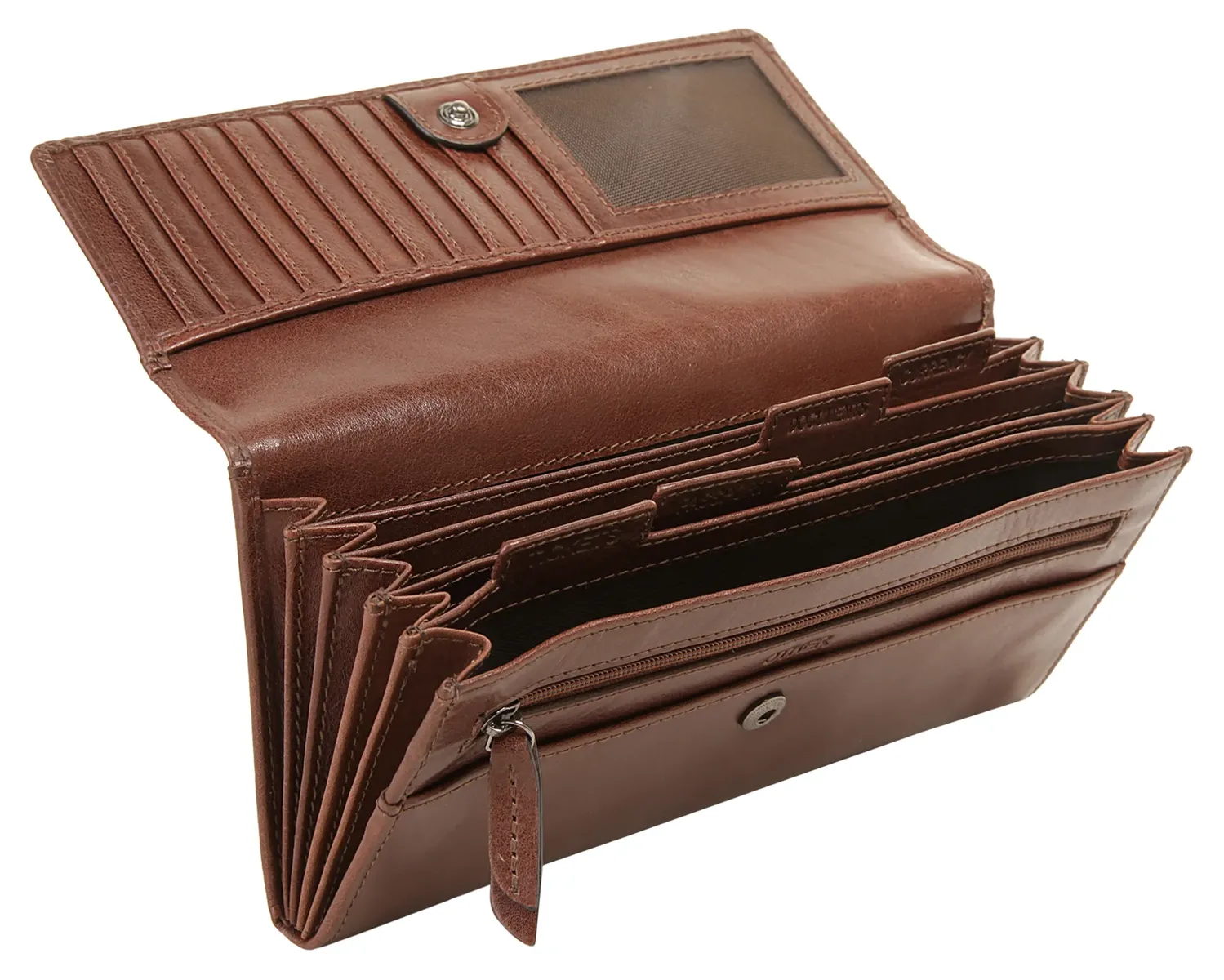 3 кармана, 12 отделений для карточек, 1 отделение для фотографий и 5 отделений для купюр.