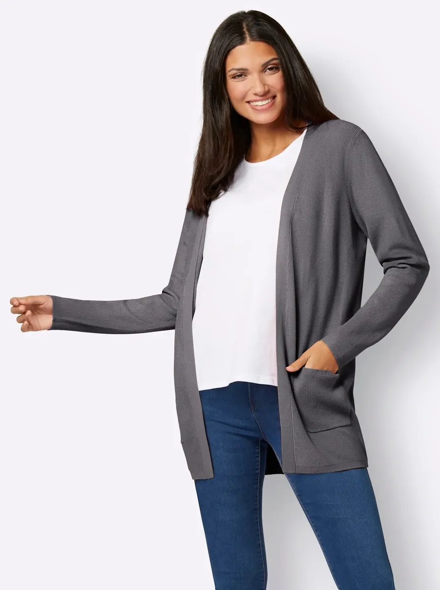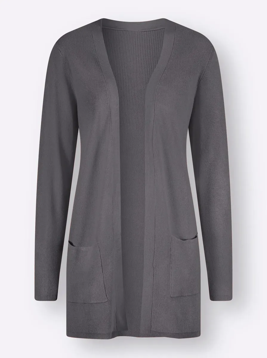 Ваше красивое и мягкое сочетание, любимое во многих случаях: длинный кардиган изящной открытой формы. С визуально удлинённым V-образным вырезом, двумя накладными карманами и ребристыми манжетами на рукавах и подоле. 80% вискоза, 20% полиамид. Машинная стирка.