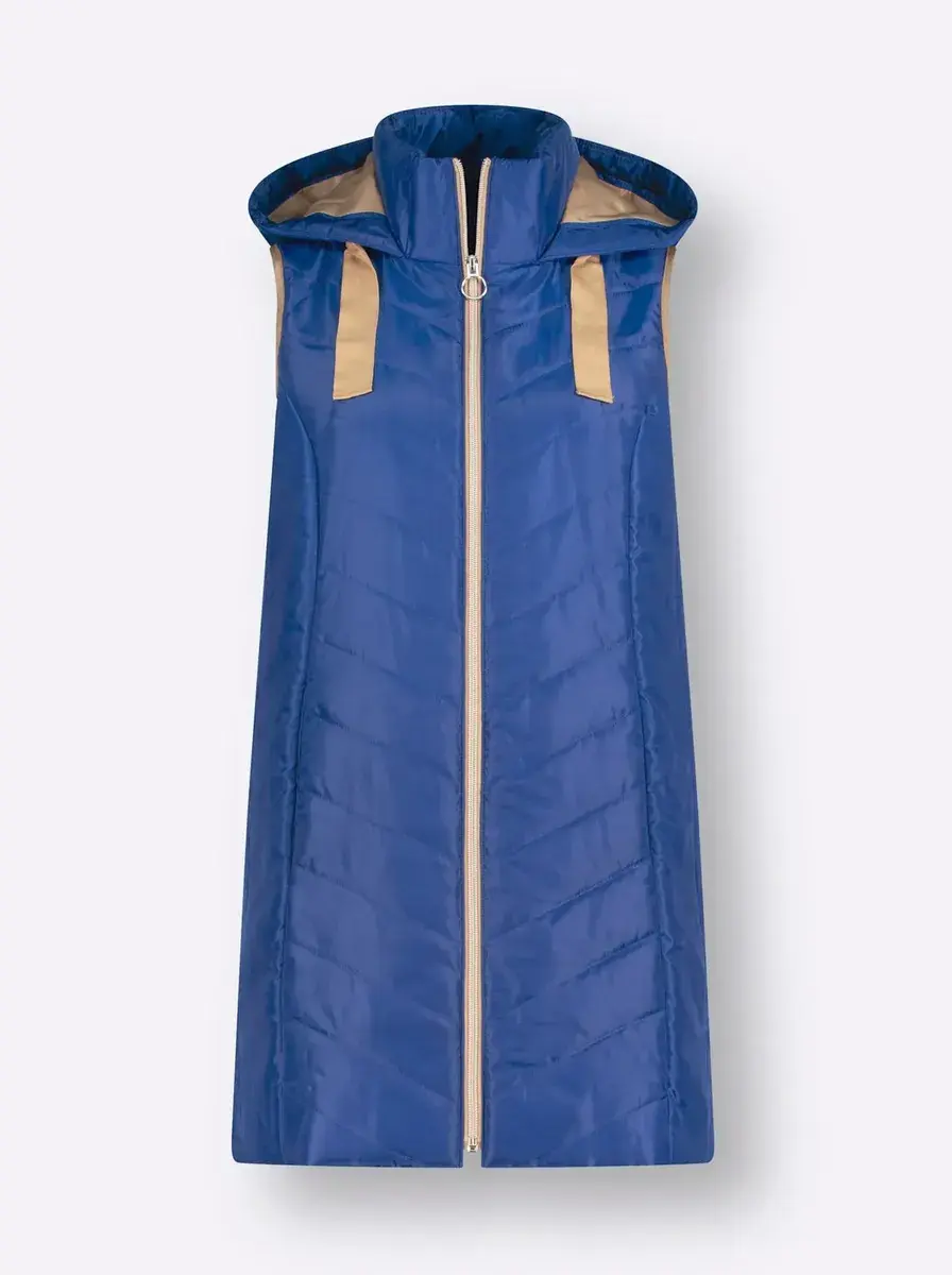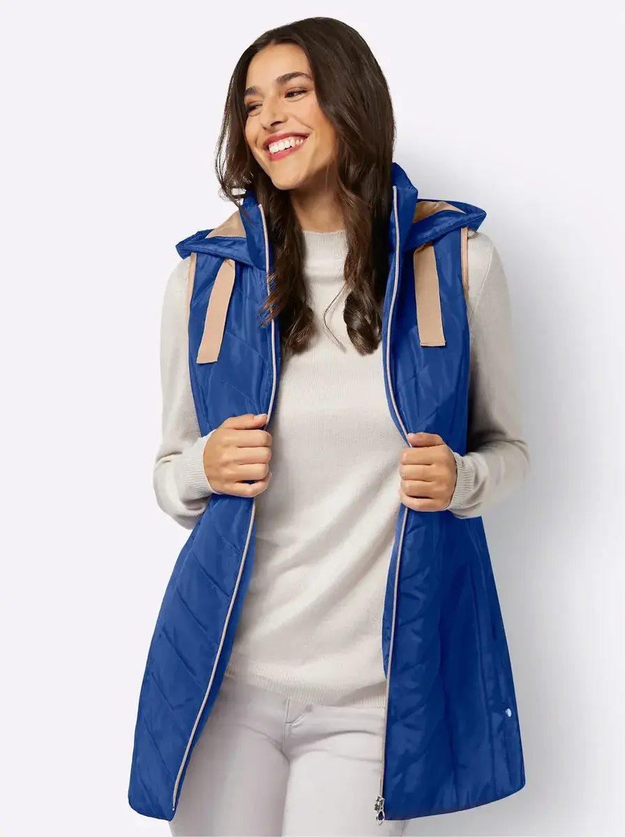 Вдвойне убедительно: длинный стеганый жилет согреет и в то же время растянет верхнюю часть тела! Детальная отделка на капюшоне с широкой кулиской, на боковых разрезах с кнопками и на внутренней подкладке контрастного цвета. Молния спереди до воротника-стойки. 2 кармана. Полностью на подкладке и с подкладкой. 100% полиэстер. Подкладка: 100% полиэстер. Наполнитель: 100% полиэстер. Машинная стирка.