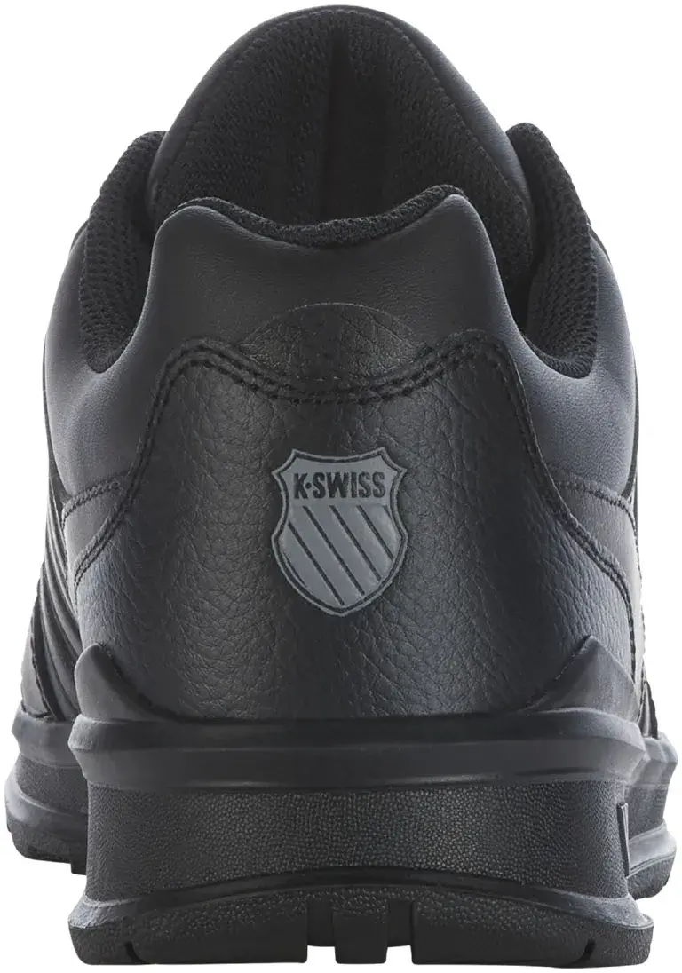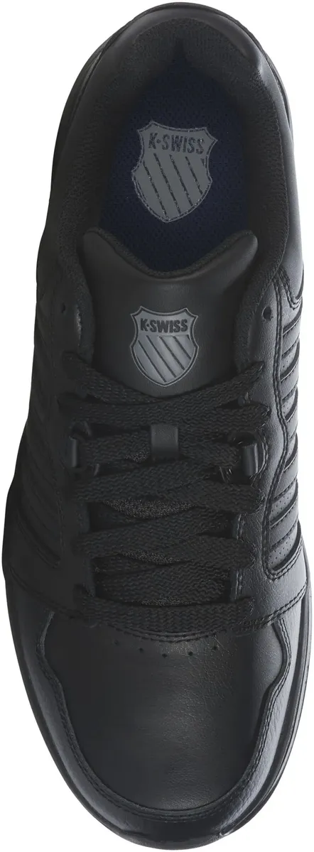 Кроссовки K-Swiss помогут создать спортивный образ и на работе. Обувь имеет шнуровку. Это позволяет подогнать ширину обуви под форму стопы. Благодаря слегка профилированной подошве обувь уже не такая скользкая. Кожаный верх позволяет коже дышать, удобен и качественен. Деловой образ можно быстро составить с брюками чинос и белой рубашкой. Рубашка должна быть заправлена ​​за пояс так, чтобы не было складок.