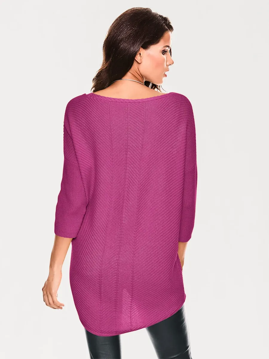V-образный пуловер в модном стиле оверсайз. Удобный материал. Привлекательная трикотажная смесь. Сзади отрежьте немного длиннее. Рукава 3/4. Длина около 76 см. 50% хлопок, 50% полиакрил. Машинная стирка.