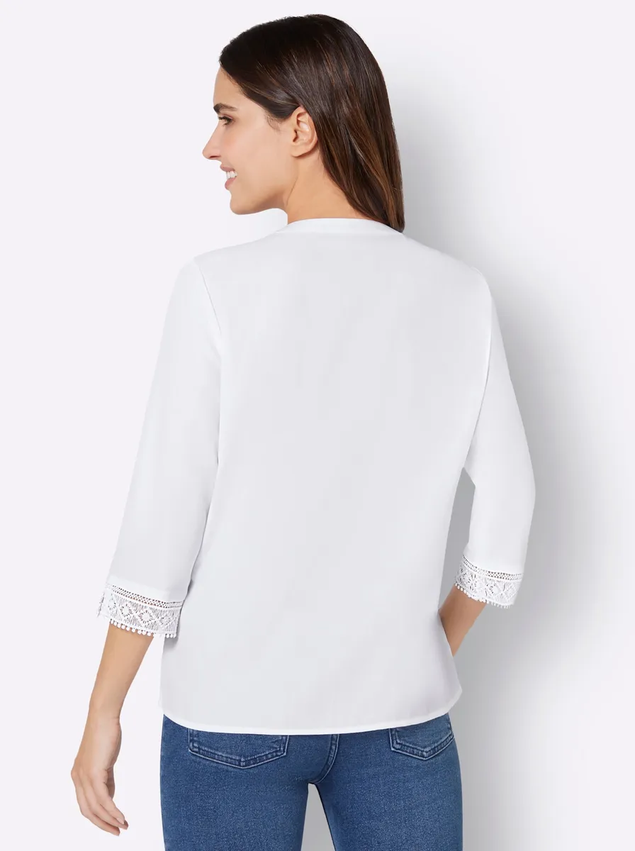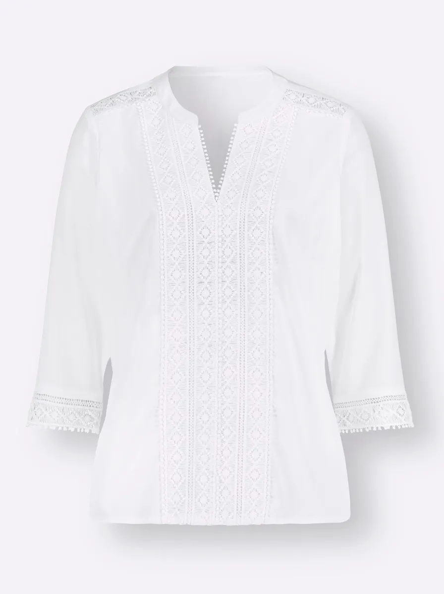 Абсолютно высший класс! Блуза без шнуровки с ажурными кружевными вставками на плечах, спереди и в конце рукавов 3/4 с разрезом. Круглый вырез. Качество крепа, за которым легко ухаживать. 100% полиэстер. Машинная стирка.