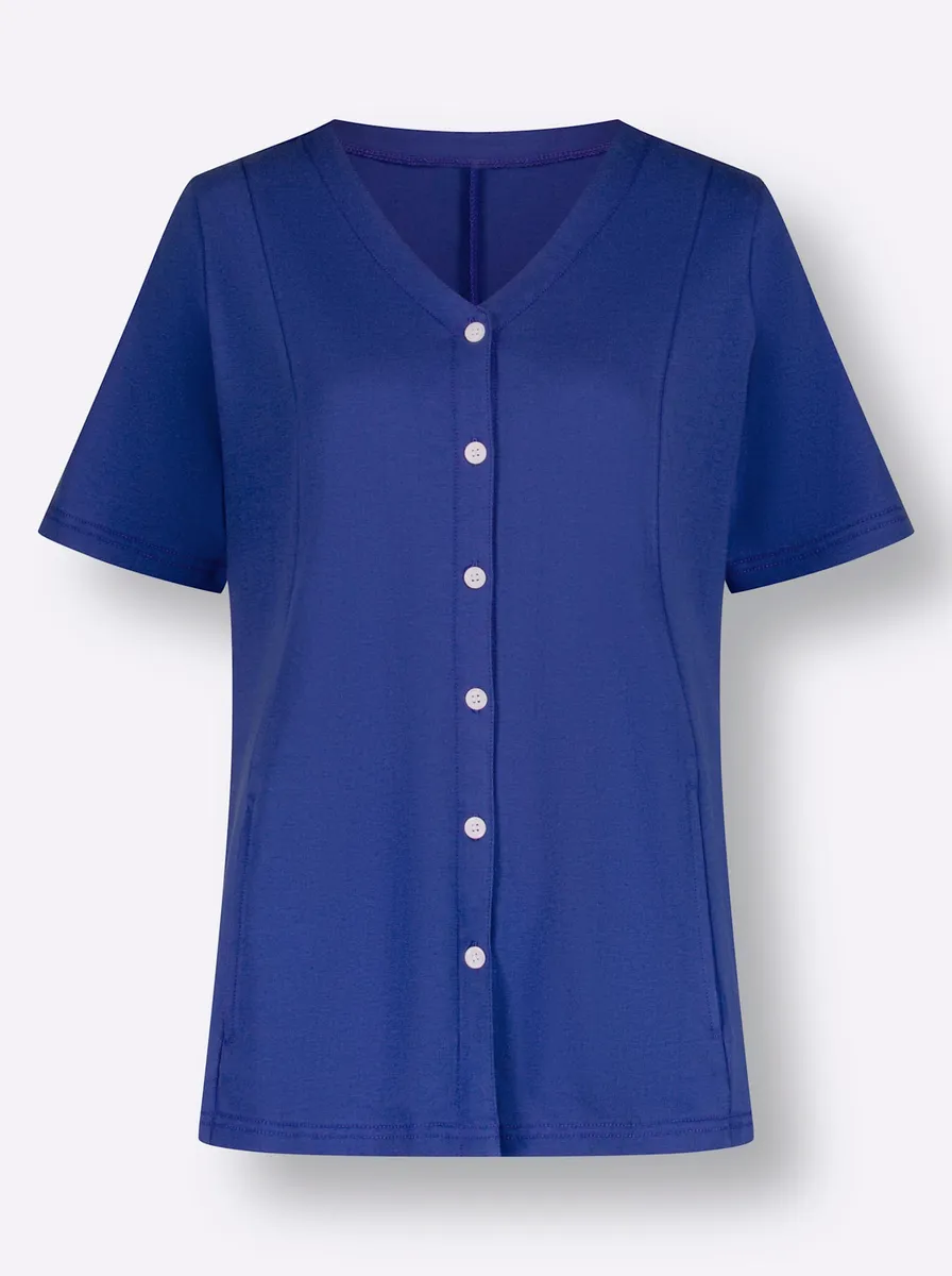 Великолепная комбинированная куртка-рубашка привлекательного А-образного силуэта. V-образный вырез и планка на пуговицах во всю длину. Визуально растягивают разделительные швы. 2 кармана и короткие рукава. 100% хлопок. Машинная стирка.