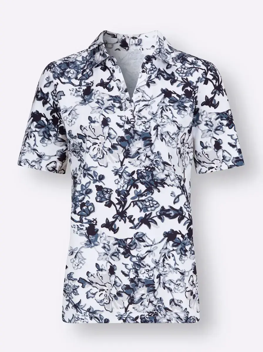 Аккуратная рубашка-поло с цветочным узором. С открытым воротником-поло. 100% хлопок. Машинная стирка.
