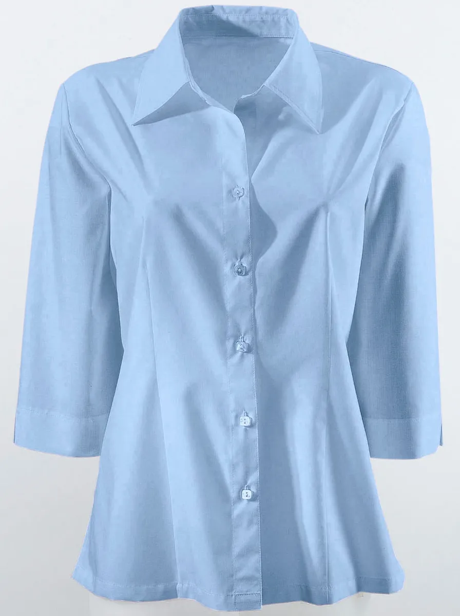 Классическая блузка с рукавами 3/4, квадратными пуговицами и разрезами по бокам. 65% полиэстер, 35% хлопок. Машинная стирка.