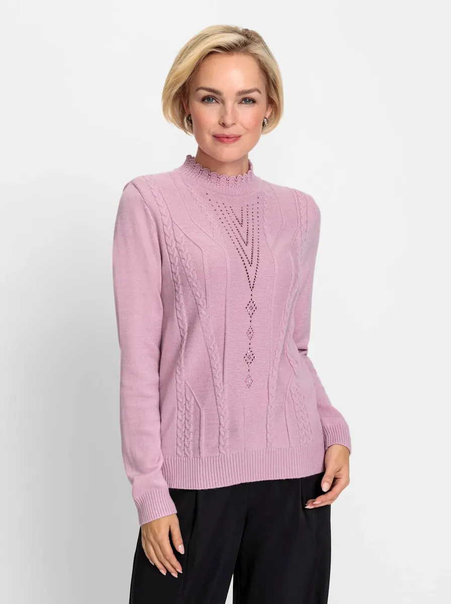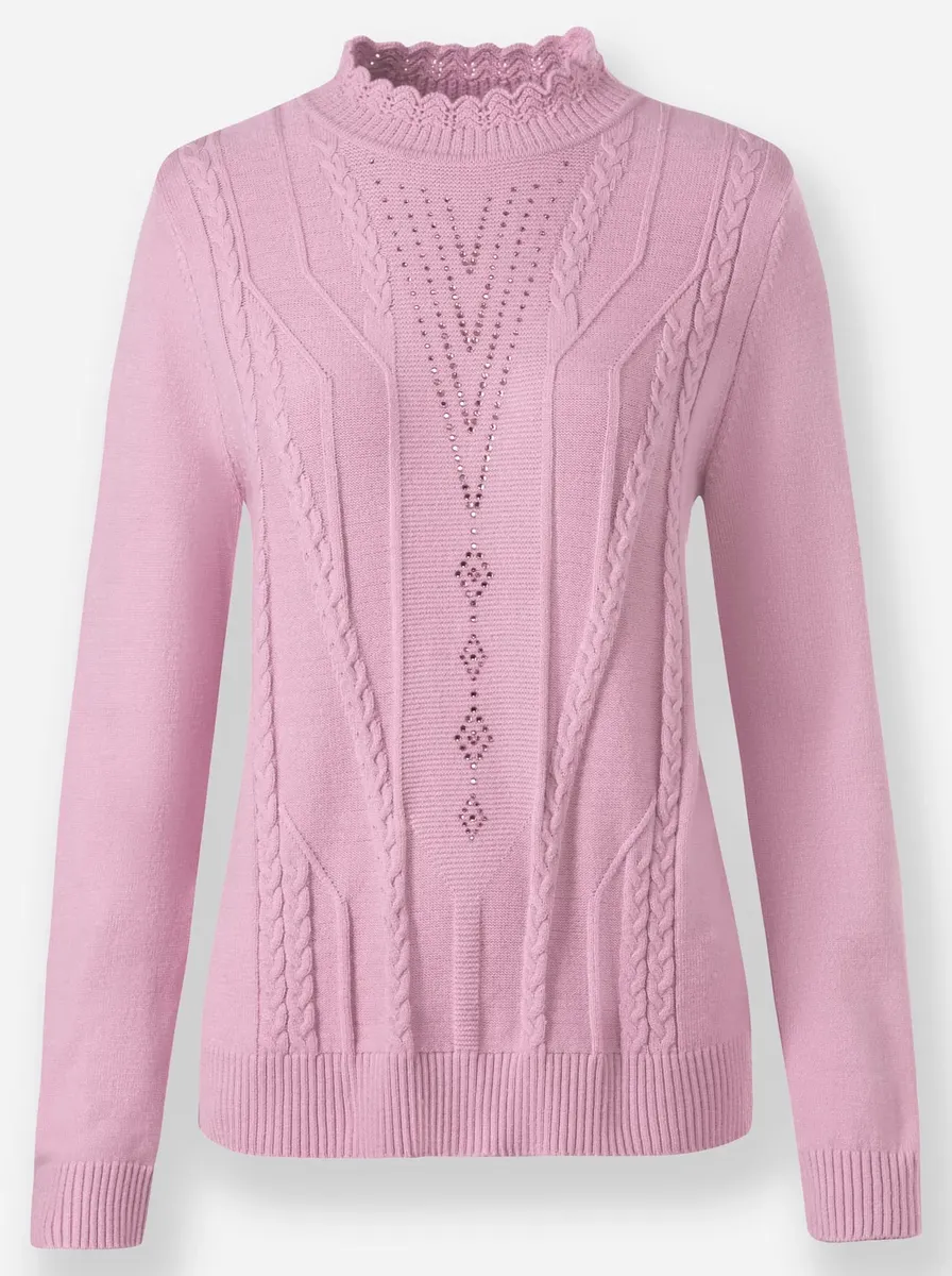 Аккуратный свитер мягкого зимнего качества. С искусно изогнутым воротником-стойкой, эластичным трикотажным узором и декором из стразов спереди. Связано по форме, подходящей по размеру. 50% вискоза, 28% полиэстер, 22% полиамид. Машинная стирка.