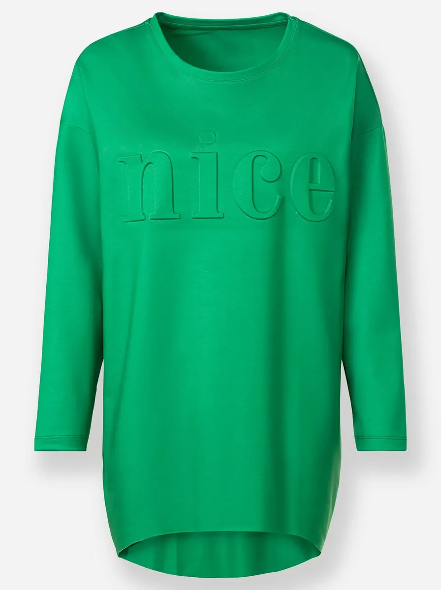 Актуальная длинная рубашка с рельефной надписью спереди «NICE». С круглым вырезом, длинными рукавами, небрежным вырезом на плечах и модным открытым подолом рубашки. Передняя часть короче. Мягкое качество. Поддержите инициативу «Хлопок, сделанный в Африке». 100% хлопок. Машинная стирка.