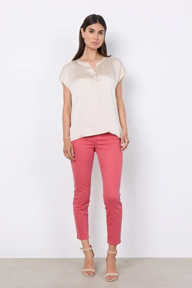 Эта блузка имеет планку с пуговицами на V-образном вырезе, свободную шелковистую текстуру и короткие рукава.