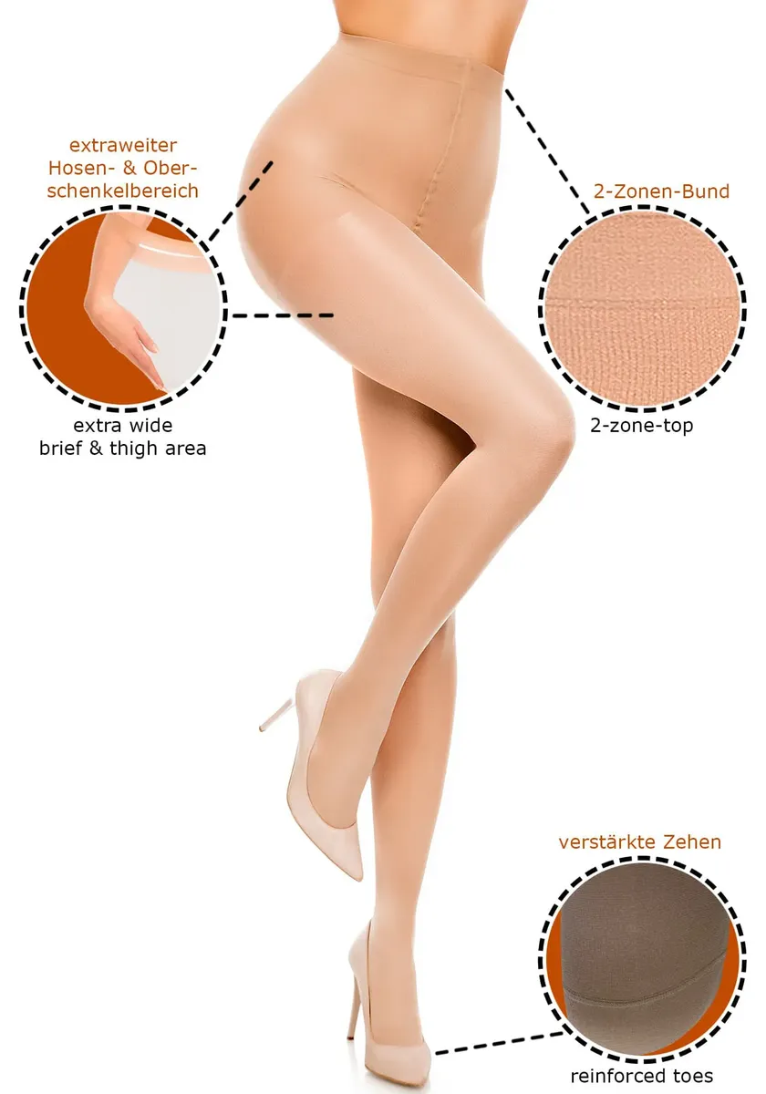 Блестящий вид придает вашим ногам неотразимую элегантность и делает их привлекательными в любой комнате. Благодаря широкому вырезу трусиков и области бедер эти колготки не только обеспечивают оптимальную посадку, но и создают ощущение роскоши. Колготки имеют продуманно расположенный плоский шов и усиленный мысок, что гарантирует максимальный комфорт и долговечность. Бесшовный плоский шов обеспечивает безупречный и гладкий внешний вид, а усиленный кончик защищает от преждевременного износа.