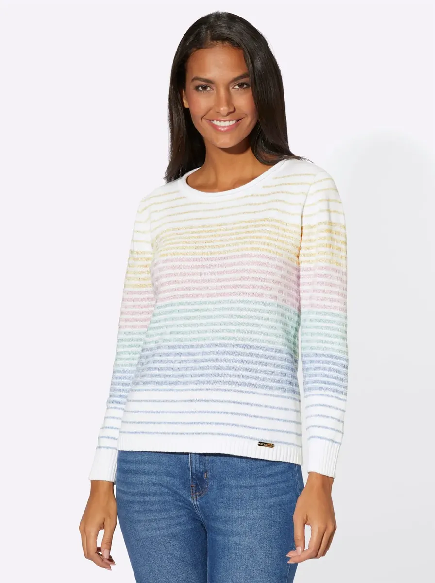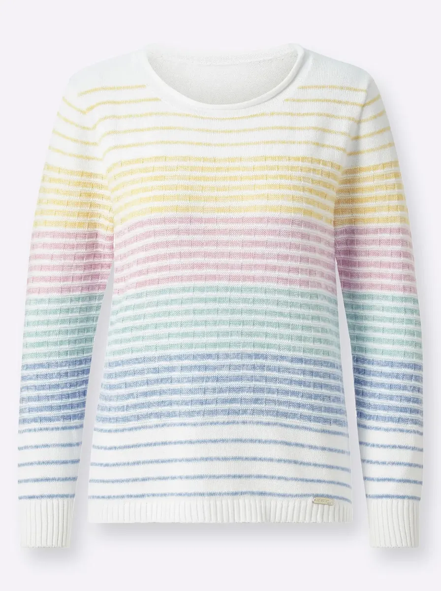 Веселый, повседневный и удобный: свитер в полоску с разными узорами вязки. С закругленным краем на круглом вырезе и ребристыми манжетами на длинных рукавах и по нижнему краю. Вырез ловко облегает фигуру. 75% хлопок, 25% полиакрил. Машинная стирка.