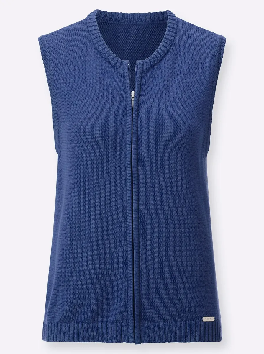 Его быстро надевают и легко комбинировать! Вязаный жилет без рукавов с круглым вырезом и молнией. 50% хлопок, 50% полиакрил. Машинная стирка.