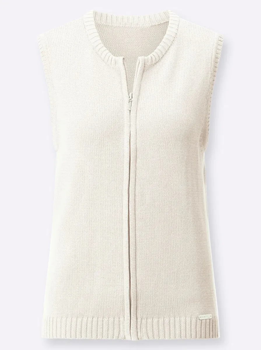 Его быстро надевают и легко комбинировать! Вязаный жилет без рукавов с круглым вырезом и молнией. 50% хлопок, 50% полиакрил. Машинная стирка.