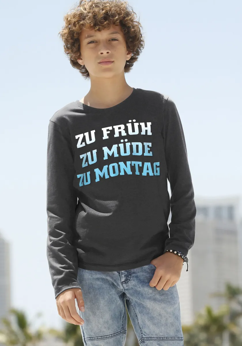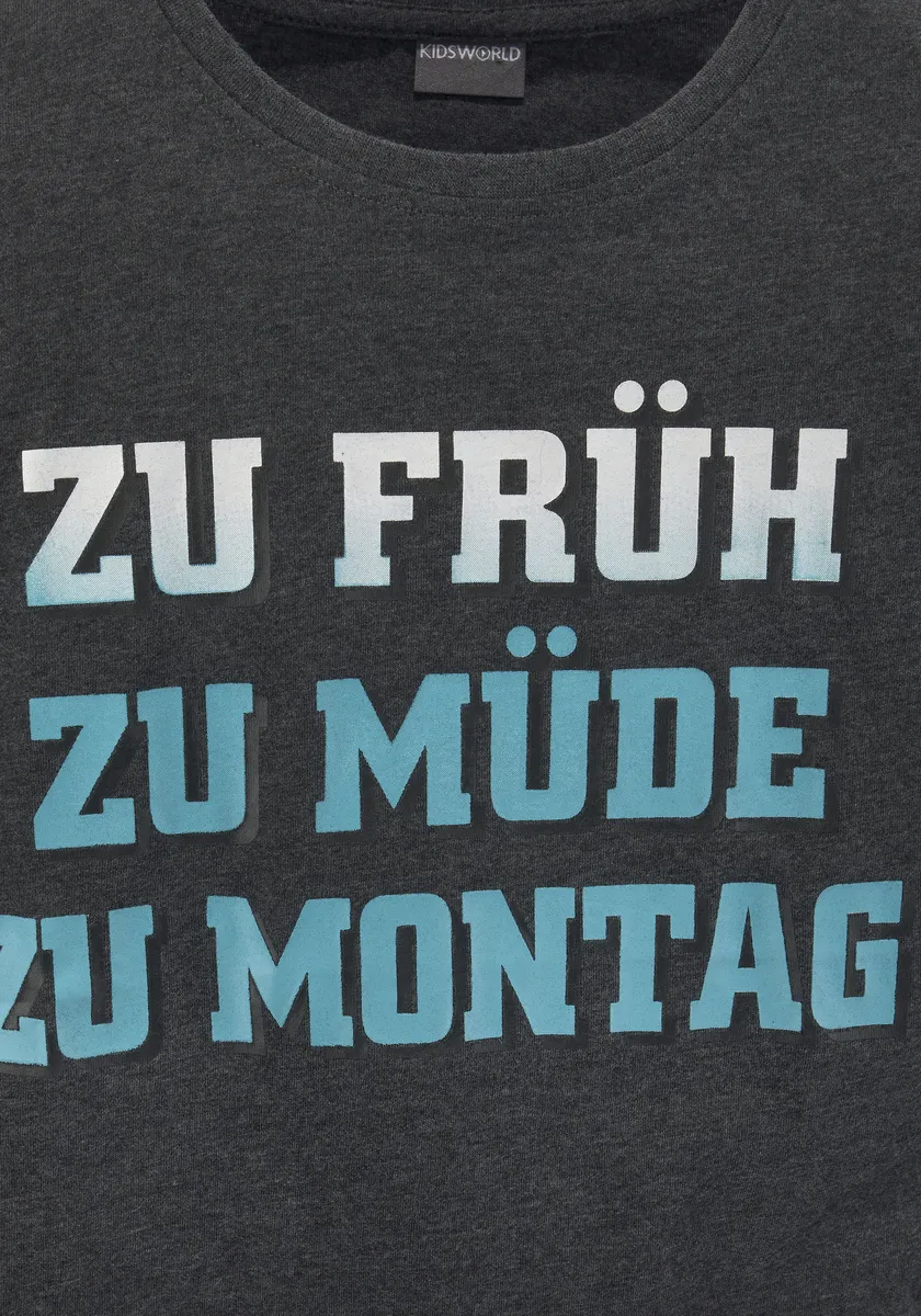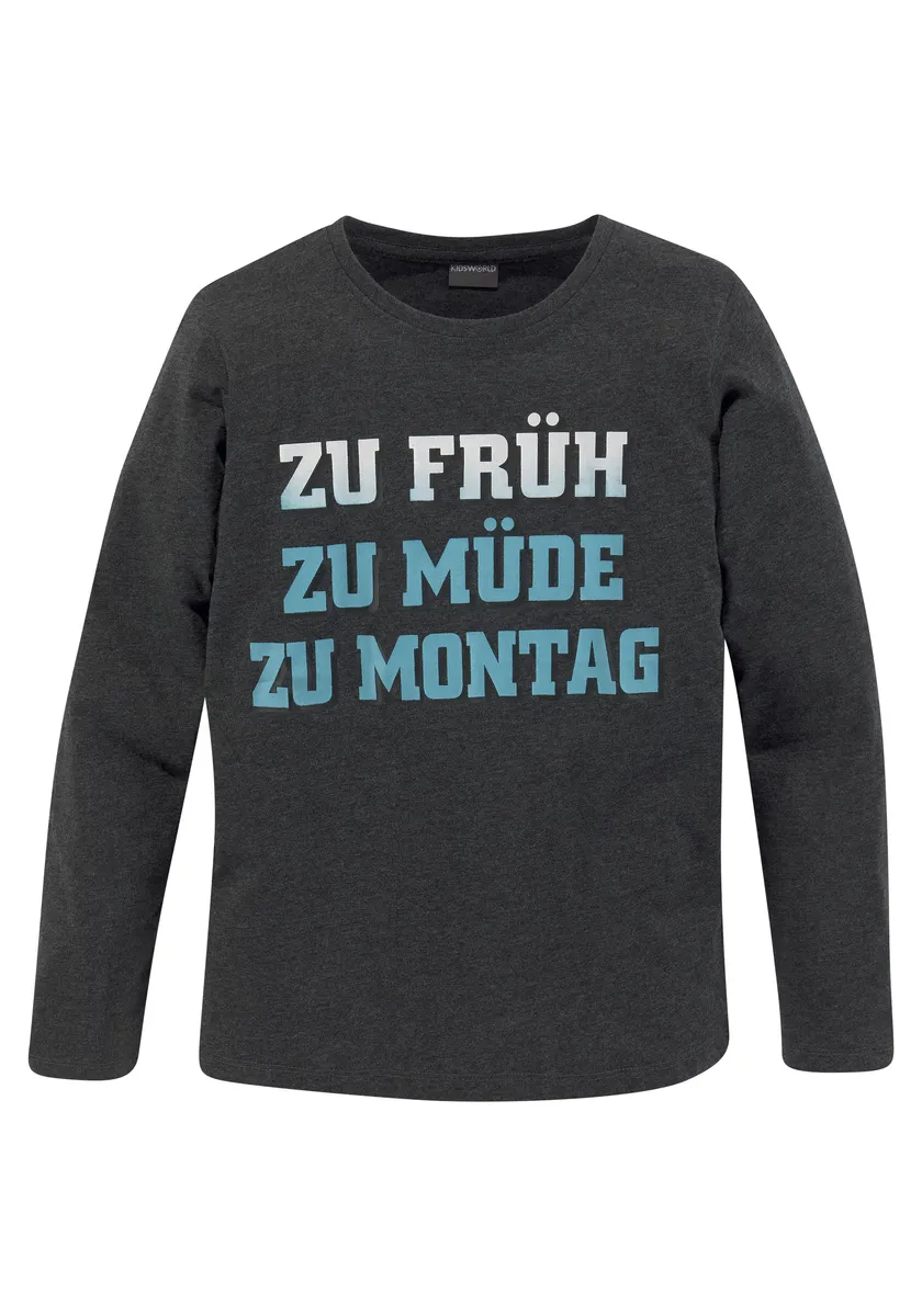 Рубашка KIDSWORLD с длинными рукавами "СЛИШКОМ РАНО, СЛИШКОМ УСТАЛО, СЛИШКОМ ПОНЕДЕЛЬНИК", антрацит