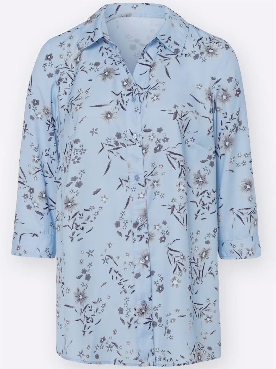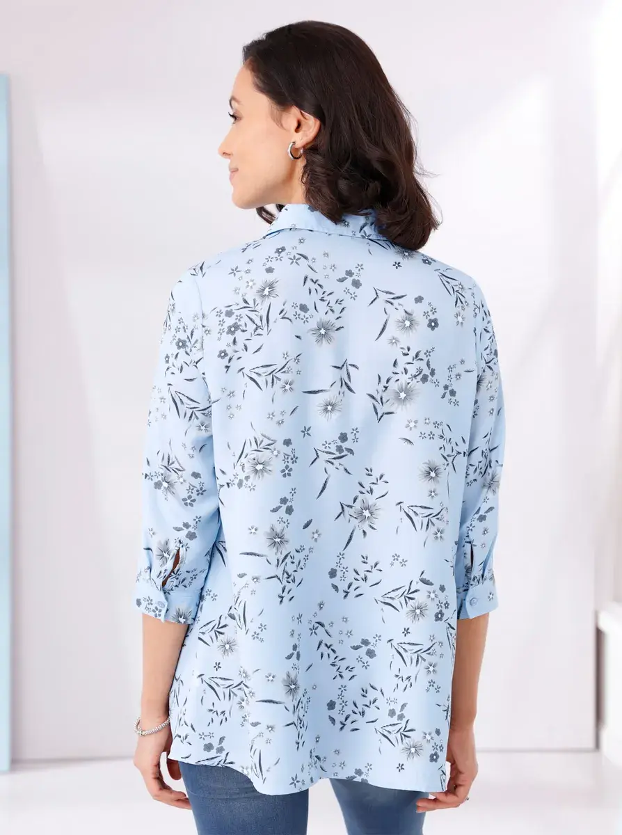 Алала-ла-ла-ла! Эта эффектная длинная блузка с красивым цветочным узором обязательно вам понравится. Слегка расклешенный крой очень моден и умело скрывает небольшие изгибы. С открытым воротником рубашки и планкой на пуговицах во всю длину. Вытачки на груди обеспечивают идеальную посадку. Модные рукава 3/4 с манжетами на пуговицах. Перед и спинка со слегка закругленным краем. 100% полиэстер. Машинная стирка.