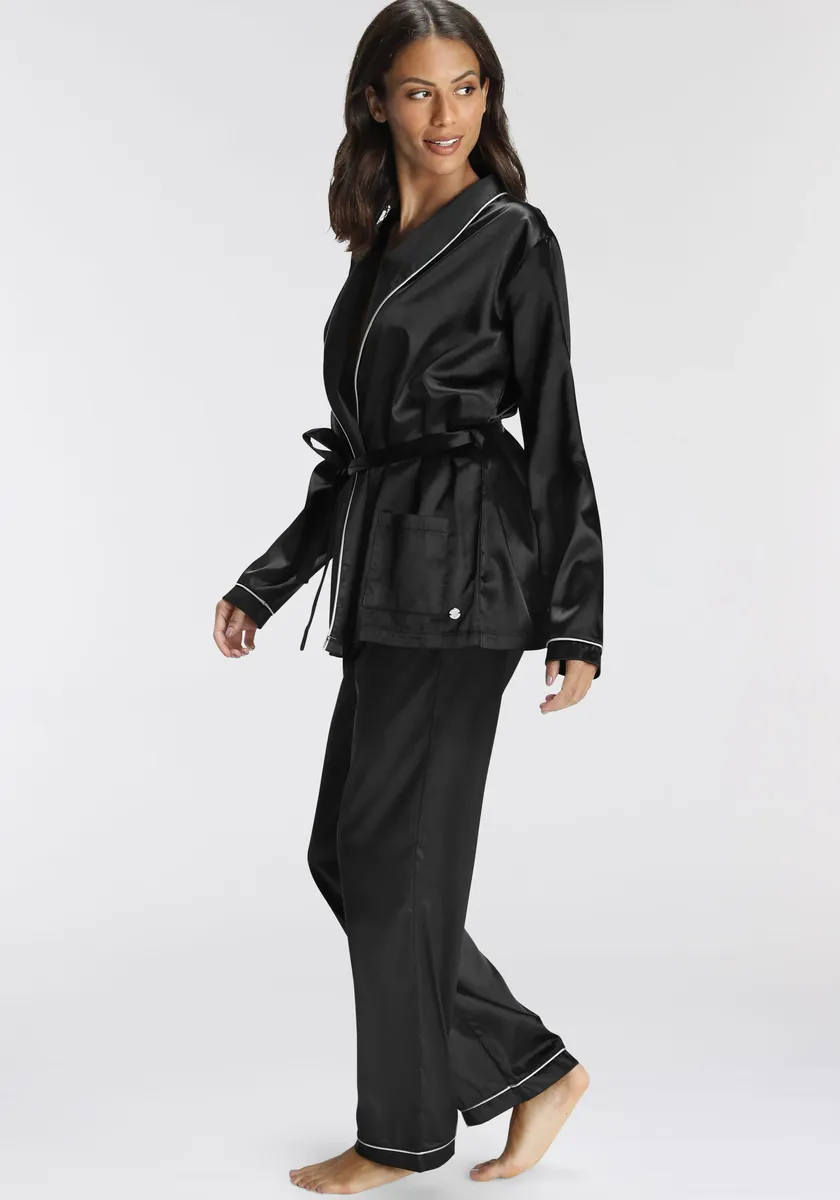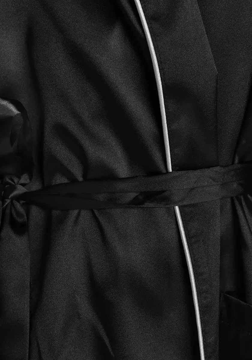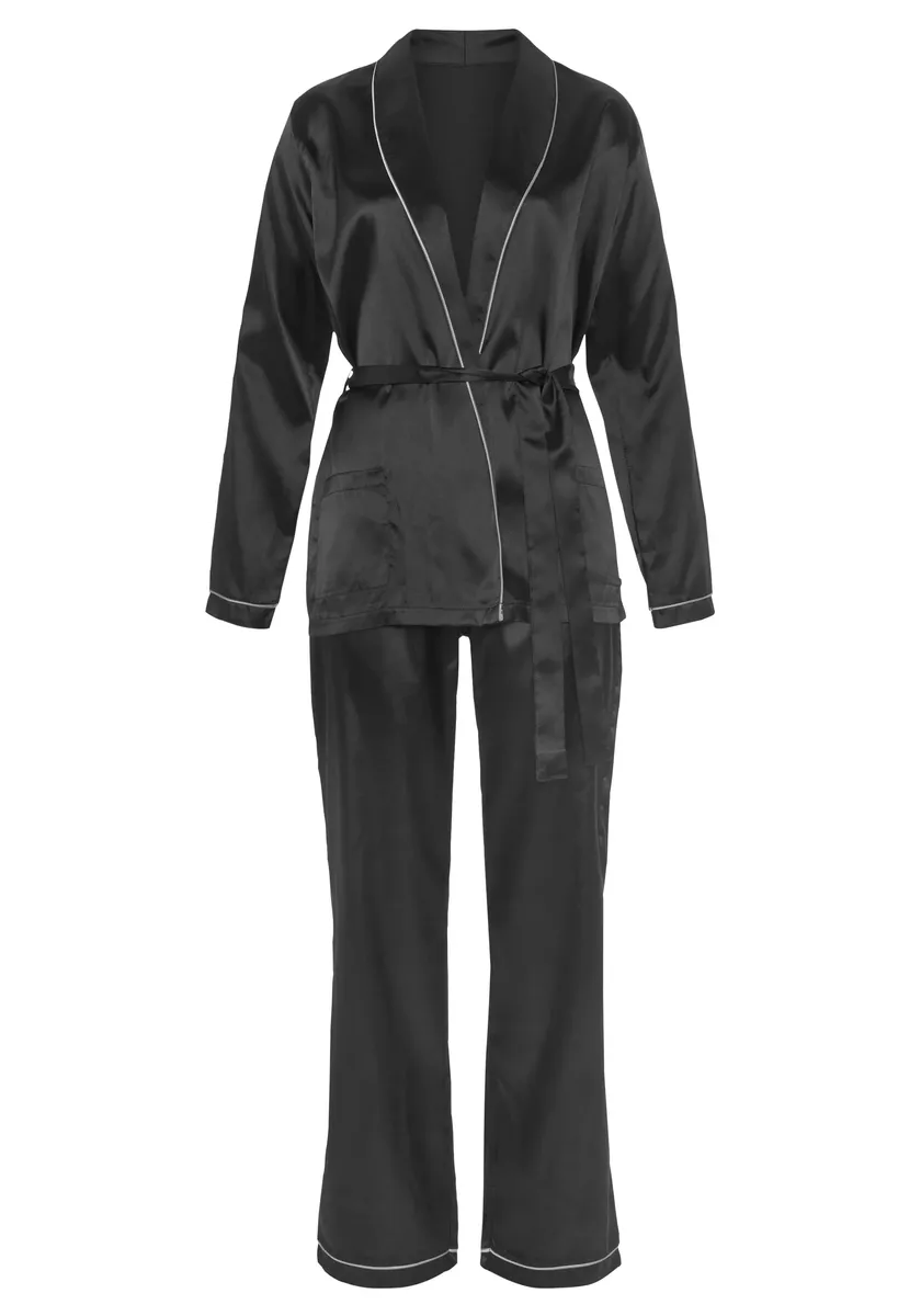Атласная пижама с контрастной окантовкой. Топ с запахом, длинными рукавами и свободным поясом на талии. Длинные брюки с эластичным поясом.