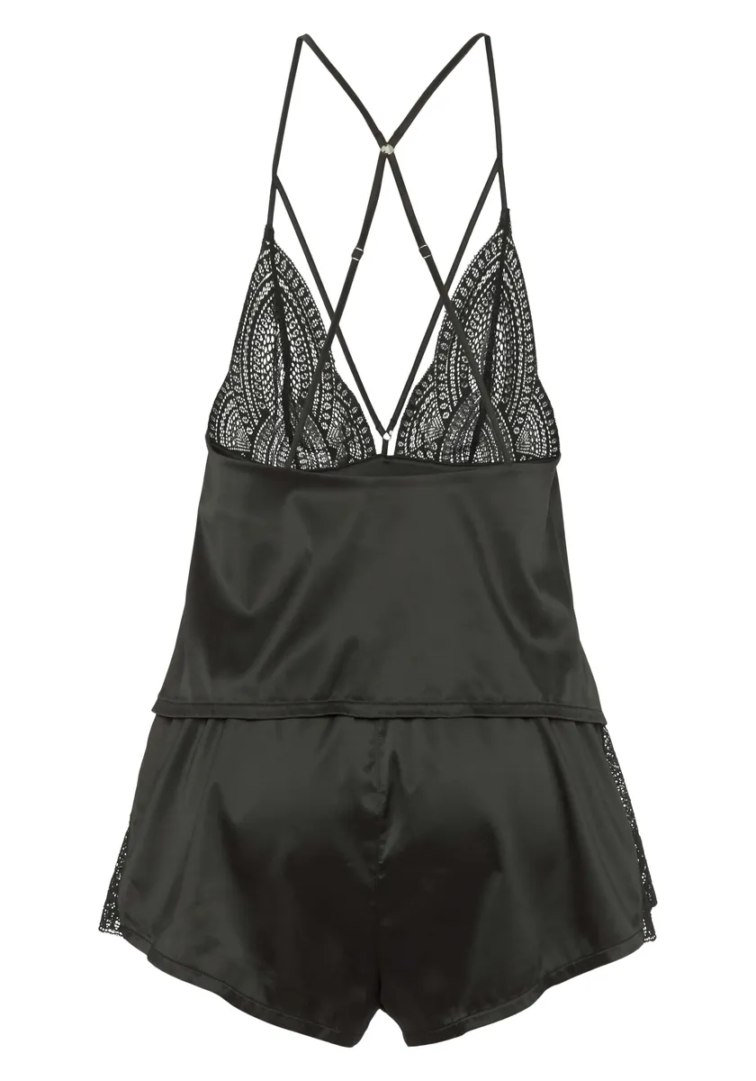 Атласные шорты с кружевными деталями. Топ на бретелях с кружевными чашечками и декоративной лентой вдоль глубокого V-образного выреза. Шорты с эластичным поясом и V-образной кружевной вставкой спереди. Эластичный атлас для приятного комфорта при ношении. Изготовлен из 90% полиэстера, 10% эластана. Кружево: 90% полиамид, 10% эластан.